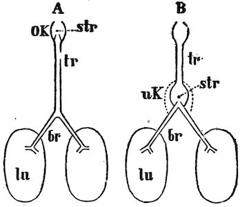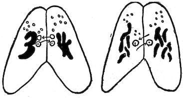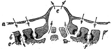 Oxidation and Deoxidation.—The union of oxygen with carbon and other substances, which occurs in fires and in the bodies of animals, is called oxidation. The separation of the oxygen from carbon such as occurs in the leaves of plants is called deoxidation. The first process sets energy free, the other process stores it up. Animals give off carbon dioxide from their lungs or gills, and plants give off oxygen from their leaves. But plants need some energy in growing, so oxidation also occurs in plants, but to a far less extent than in animals. At night, because of the absence of sunlight, no deoxidation is taking place 6in the plant, but oxidation and growth continue; so at night the plant actually breathes out some carbon dioxide. The deepest part of the lungs contains the most carbon dioxide. Why was it necessary to empty the lungs as nearly as possible in the experiment with the candle? Why would first drawing a deep breath interfere with the experiment? Why does closing the draught of a stove, thus shutting off part of the air, lessen the burning? Why does a “firefly” shine brighter at each breath? Why is the pulse and breathing faster in a fever? Very slow in a trance?