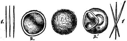 Cell and Protoplasm.—Both plants and animals are composed of small parts called cells. Cells are usually microscopic in size. They have various shapes, as spherical, flat, cylindrical, fibre-like, star-shaped. The living substance of cells is called protoplasm. It is a stiff, gluey fluid, albuminous in its nature. Every cell has a denser spot or kernel called a nucleus, and in the nucleus is a still smaller speck called a nucleolus. Most cells are denser and tougher on the outside, and are said to have a cell wall, but many cells are naked, or without a wall. Hence the indispensable part of a cell is not the wall but the nucleus, 7and a cell may be defined as a bit of protoplasm containing a nucleus. This definition includes naked cells as well as cells with walls.