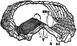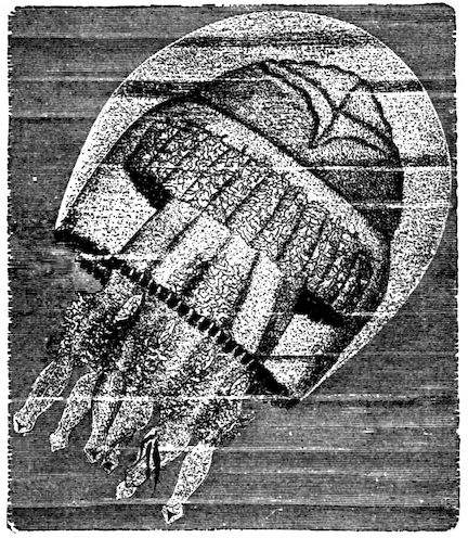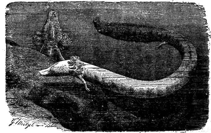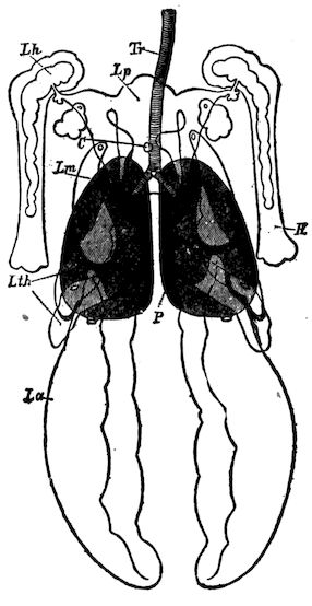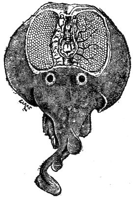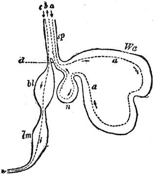 Source of the Amœba’s Energy.—We thus see that the amœba moves without feet, eats without a mouth, digests without a stomach, feels without nerves, and, it should also be stated, breathes without lungs, for oxygen is absorbed from the water by its whole 13surface. Its movements require energy; this, as in all animals, is furnished by the uniting of oxygen with the food. Carbon dioxide and other waste products are formed by the union; these pass off at the surface of the amœba and taint the water with impurities.