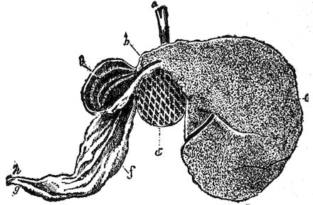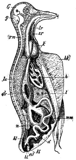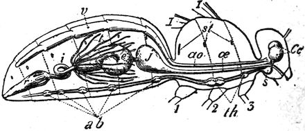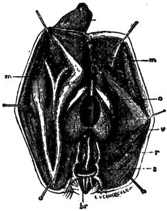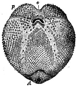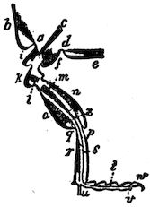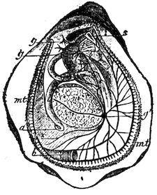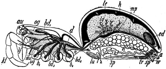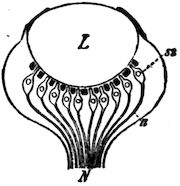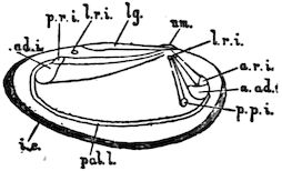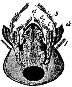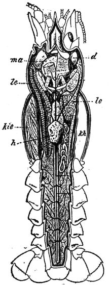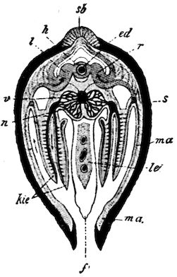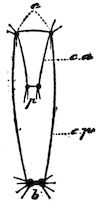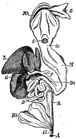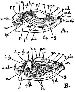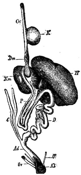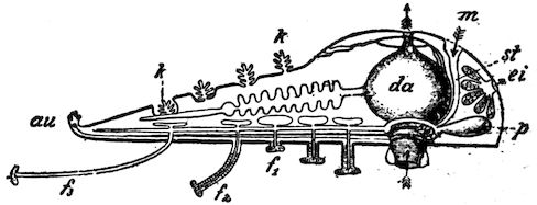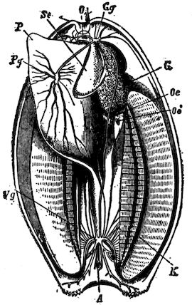 Two contractile vacuoles, cv; the macronucleus, mg; two micronuclei, mi; the gullet (Œ), a food ball forming and ten food balls in their course from gullet to vent, a.