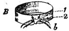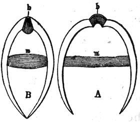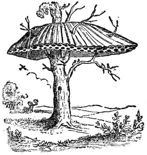 | Fig. 3.—Colourless plants, as Mushrooms, give off no oxygen. | A green leaf, even after it is cut, gives off oxygen (O) if kept in the sun. |