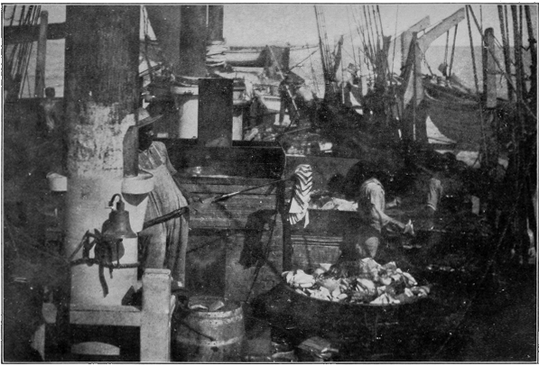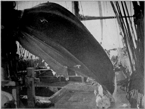 The homeward voyage was not a time of idleness. We were kept busy a large part of the time cleaning the bone of our last three whales—the bone from our first whale had been shipped to San Francisco from Unalaska. As we had at first stowed it away, the baleen was in bunches of ten or a dozen slabs held together at the roots by "white horse," which is the whaler name for the gums of the whale. These bunches were now brought up on deck and each slab of baleen was cut out of the gums separately and washed and scoured with cocoanut rind procured for the purpose in the Hawaiian Islands. Then the slabs were dried and polished until they shone like gun metal, tied into bales, and stowed under hatches once more.