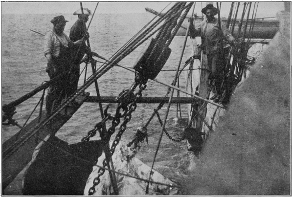 After the brig had been laid aback near the ice, a boat was lowered and a hole was cut in the bow of the whale's head. A cable was passed through this and the other end was made fast aboard the ship. Then under light sail, the brig set about the work of pulling the whale out of the ice. The light breeze fell away and the three boats were strung out ahead with hawsers [ 246 ] and lent assistance with the oars. It was slow work. But when the breeze freshened, the ice began gradually to give, then to open up, and finally the whale was hauled clear and drawn alongside for the cutting in.