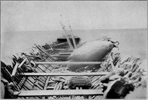But with the whale dead, we still had a big problem on our hands. In some way the giant [ 242 ] bulk had to be hauled out of the ice. This was a difficult matter even with plenty of time in which to do it. Night was coming on and it was the brig's custom in the hours of darkness to sail far away from the great ice pack with its edging of floating bergs and floes in order to avoid possible accident and to sail back to the whaling grounds on the morrow. This Captain Shorey prepared to do now. As a solution of the dilemma, an empty bread cask or hogshead was brought on deck and the name of the brig was seared in its staves with a hot iron in several places. This cask was towed to the floe, hauled up on the edge of the ice, and the long line of one of the harpoons sticking in the whale was made fast to it by means of staples. Thus the cask marked the floe in which the whale was lying.
