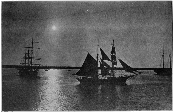 Again the "roaring forties" lived up to their name and buffeted us with gale and storm. The first land we sighted after leaving the Fox Islands was the wooded hills of northern California. I shall never forget how beautiful those hills appeared and what a welcome they seemed to hold out. They were my own country again, the United States—home. My eyes grew misty as I gazed at them and I felt much as a small boy might feel who, after long absence, sees his mother's arms open to him. The tug that picked us up outside of Golden Gate at sundown one day seemed like a long lost friend. It was long [ 250 ] after darkness had fallen, that it towed us into San Francisco harbor, past the darkly frowning Presidio and the twinkling lights of Telegraph Hill, to an anchorage abreast the city, brilliantly lighted and glowing like fairyland. I never in all my life heard sweeter music than the rattle and clank of the anchor chain as the great anchor plunged into the bay and sank to its grip in good American soil once more.