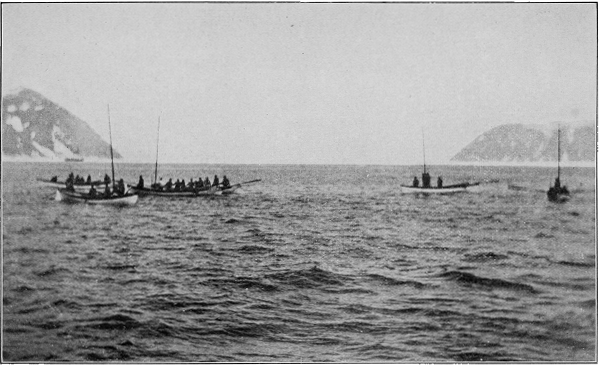 In a few minutes Gabriel was heading after the mate's boat. Neither boat hoisted sail. With four men at the sweeps, it was as much as the boats could do to gain on the brute. If the bear was not making fifteen miles an hour, I'm no judge.