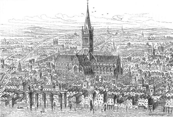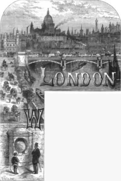 "The moon has now increased in power, and, acting on the mist, brings out the surrounding churches one by one. There they stand in the soft light, a noble army of temples thickly sprinkled amongst the money-changers. Any taste may be suited in structural design. There are high churches, low churches; flat churches; broad churches, narrow churches; square, round, and pointed churches; churches with towers like[Pg 1170] cubical slabs sunk deeply in between the roofs of houses; towers like toothpicks, like three-pronged forks, like pepper-casters, like factory chimneys, like limekilns, like a sailor's trousers hung up to dry, like bottles of fish-sauce, and like St. Paul's—a balloon turned topsy-turvy. There they stand, like giant spectral watchmen guarding the silent city, whose beating heart still murmurs in its sleep. At the hour of midnight they proclaim, with iron tongue, the advent of a New Year, mingling a song of joy with a wail for the departed....