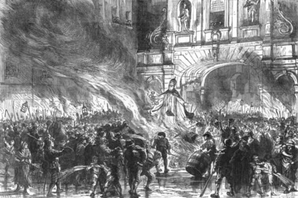 "Then, then the City did shake indeed, and the inhabitants flew away in great amazement from their houses, lest the flame should devour them. Rattle, rattle, rattle, was the noise which the fire struck upon the ear round about, as if there had been a thousand iron chariots beating upon the stones; and if you opened your eye to the opening of the streets where the fire was come, you might see in some places whole streets at once in flames, that issued forth as if they had been so many great forges from the opposite windows, which, folding together, were united into one great flame throughout the whole street; and then you might see the houses tumble, tumble, tumble, from one end of the street to the other, with a great crash, leaving the foundations open to the view of the heavens."