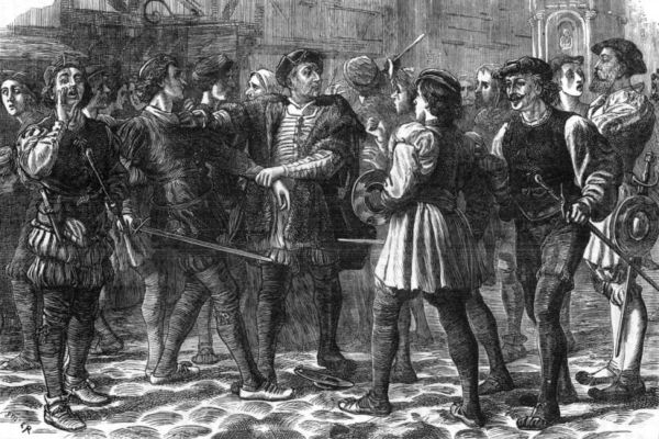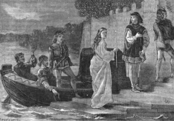 "'Thou didst swear to me upon a parcel-gilt goblet, sitting in my Dolphin chamber, at the round table, by a sea-coal fire, on Wednesday in Whitsun-week, when the prince broke thy head for likening his father to a singing-man of Windsor; thou didst swear to me then, as I was washing thy wound, to marry me, and make me my lady, thy wife. Canst thou deny it?' (Henry IV., part ii.)