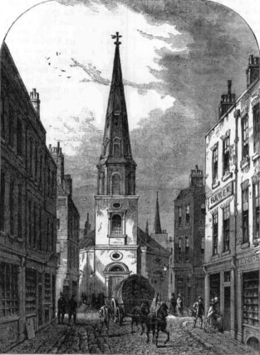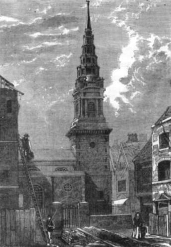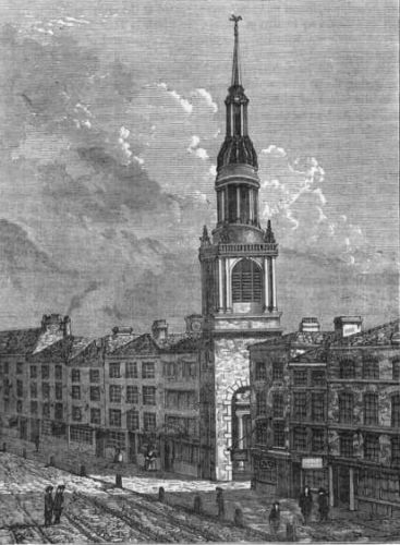 The church was destroyed at an early period of the Great Fire. It was rebuilt by Wren in 1676. The parish was then united with that of St. Margaret, New Fish Street Hill; and at a later period St. Michael's, Crooked Lane, has also been annexed. On the top of the square tower, which is terminated with an open parapet, Wren has introduced an octagon lantern of very simple and pleasing design, crowned by a cupola and short spire. We must here, once for all, remark on the fertility of invention displayed by Wren in varying constantly the form of his steeples.