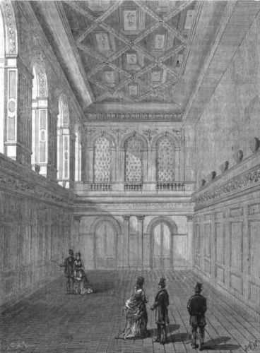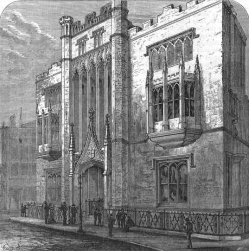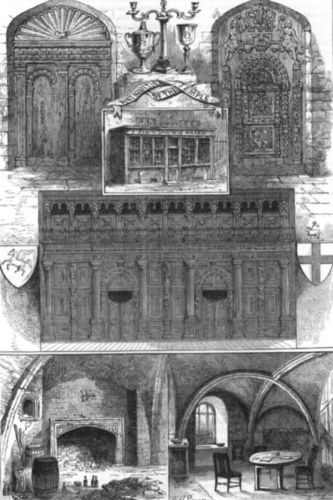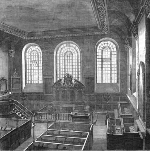 In the vestry-room, which is now at the south-west corner of the church, there is a curious drawing of the interior of Old Fishmongers' Hall on the occasion of the presentation of a pair of colours to the Military Association of Bridge Ward by Mrs. Hibbert. Many of the figures are portraits. There is also a painting of Old London Bridge, and a clever portrait of the late Mr. R. Hazard, who was attached to the church as sexton, clerk, and ward beadle for nearly fifty years.