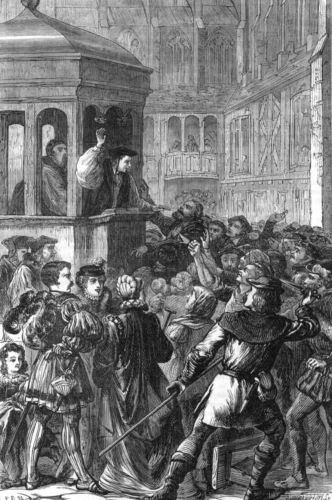 Miles Coverdale, the great reformer, was a rector of St. Magnus'. Coverdale was in early life an Augustinian monk, but being converted to Protestantism, he exerted his best faculties and influence in defending the cause. In August, 1551, he was advanced to the see of Exeter, and availed himself of that station to preach frequently in the cathedral and in other churches of Exeter. Thomas Lord Cromwell patronised him; and Queen Catherine Parr appointed him her almoner. At the funeral of that ill-fated lady he preached a sermon at Sudeley Castle. When Mary came to the throne, she soon exerted her authority in tyrannically ejecting and persecuting this amiable and learned prelate. By an Act of Council (1554-55) he was allowed to "passe towards Denmarche with two servants, his bagges and baggage," where he remained till the death of the queen. On returning home, he declined to be reinstated in his see, but repeatedly preached at Paul's Cross, and, from conscientious scruples, continued to live in obscurity and indigence till 1563, when he was presented to the rectory of St. Magnus', London Bridge, which he resigned in two years. Dying in the year 1568, at the age of eighty-one, he was interred in this church.