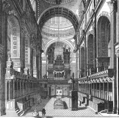 The interior of the church is divided into a nave and side aisles by Doric columns, that support an entablature from which rises the camerated ceiling. "The general proportions of the church," says Mr. Godwin, "are pleasing; but the columns are too slight, the space between them too wide, and the result is a disagreeable feeling of insecurity." The altar-piece, adorned with the figure of a pelican feeding her young, is richly carved and gilded. The large organ, built by Jordan in 1712, was presented by Sir Charles Duncomb, who gave the clock in remembrance of having himself, when a boy, been detained on this spot, ignorant of the time.