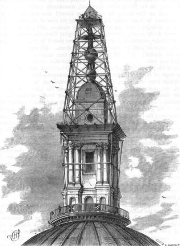 A large print of the Monument represents the statue of Charles placed, for comparative effect, beside a sectional view of the apex, as constructed. Wren's autograph report on the designs for the summit were added to the MSS. in the British Museum in 1852. A model, scale one-eighth of an inch to the foot, of the scaffolding used in building the Monument is preserved. It formerly belonged to Sir William Chambers, and was presented by Heathcote Russell, C.E., to the late Sir Isambard Brunel, who left it to his son, Mr. I.K. Brunel. The ladders were of the rude construction of Wren's time—two uprights, with treads or rounds nailed on the face.