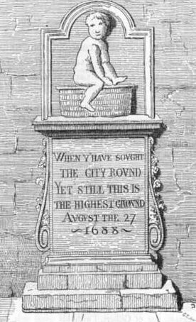 Ned Ward is very severe on the Monument. "As you say, this edifice," he says, "as well as some others, was projected as a memorandum of the Fire, or an ornament to the City, but gave those corrupted magistrates that had the power in their hands the opportunity of putting two thousand pounds into their own pockets, whilst they paid one towards the building. I must confess, all I think can be spoke in praise of it is, 'tis a monument to the City's shame, the orphan's grief, the Protestant's pride, and the Papist's scandal; and only serves as a high-crowned hat, to cover the head of the old fellow that shows it."