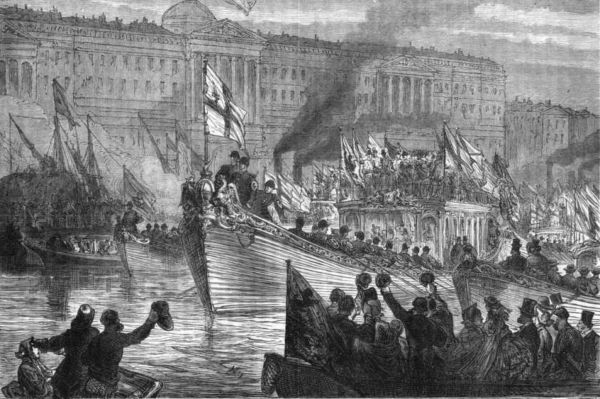 "The dark grey churches and houses spring into existence one by one. The streets come up[Pg 1171] out of the land, and the bridges come up out of the water. The bustle of commerce, and the roar of the great human ocean—which has never been altogether silent—revive. The distant turrets of the Tower, and the long line of shipping on the river, become visible. Clear smoke still flows over the housetops, softening their outlines, and turning them into a forest of frosted trees.