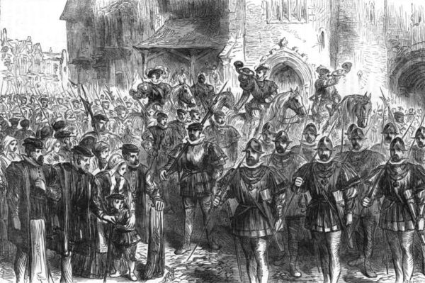 There rides behind this worthy pair a stout yeoman, such as you can see a dozen of every morning, in this reign, in ten minutes' walk down Cheapside, for the nobles' houses in the City swarm with such retainers—sturdy, brown-faced country fellows, quick of quarrel, and not disposed to bear gibes. He wears a coat and hood of Lincoln green, and has a sword, dagger, horn, and buckler by his side. The sheaf of arrows at his girdle have peacock-feathers. Ten to one but that fellow let fly many a shaft at Cressy and Poictiers, for he is fond of saying, over his ale-bowl, that he carries "ten Frenchmen's lives under his belt."