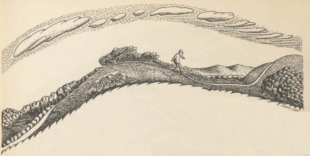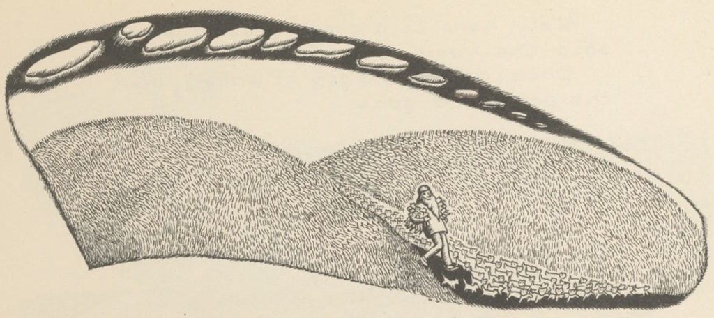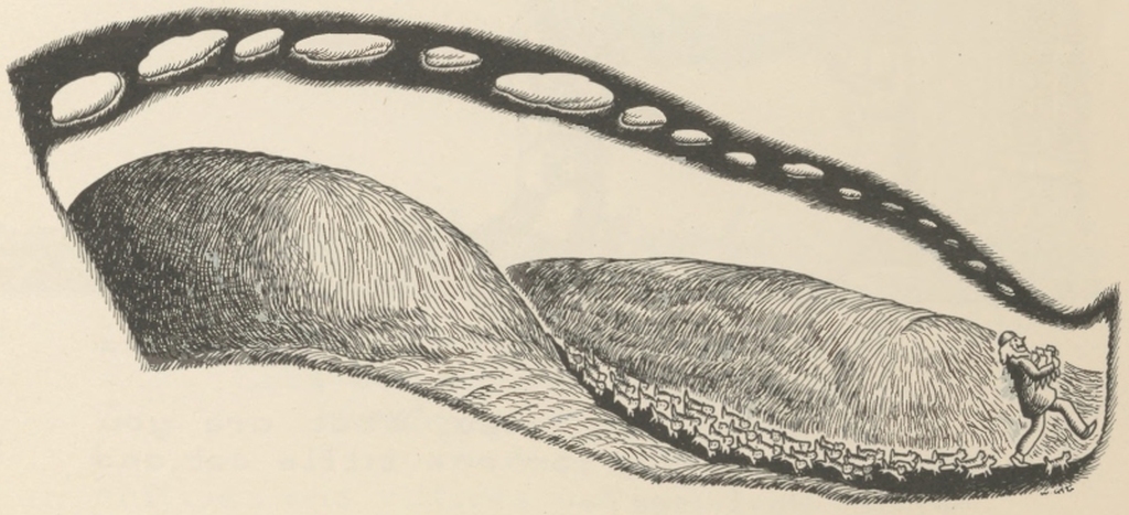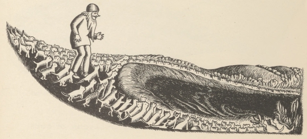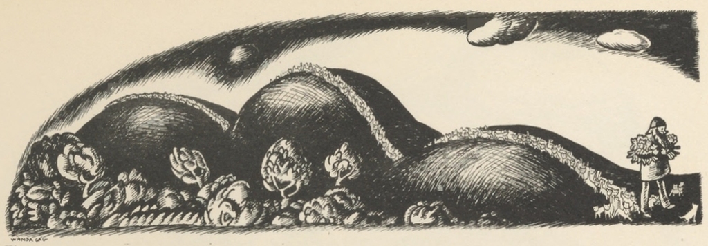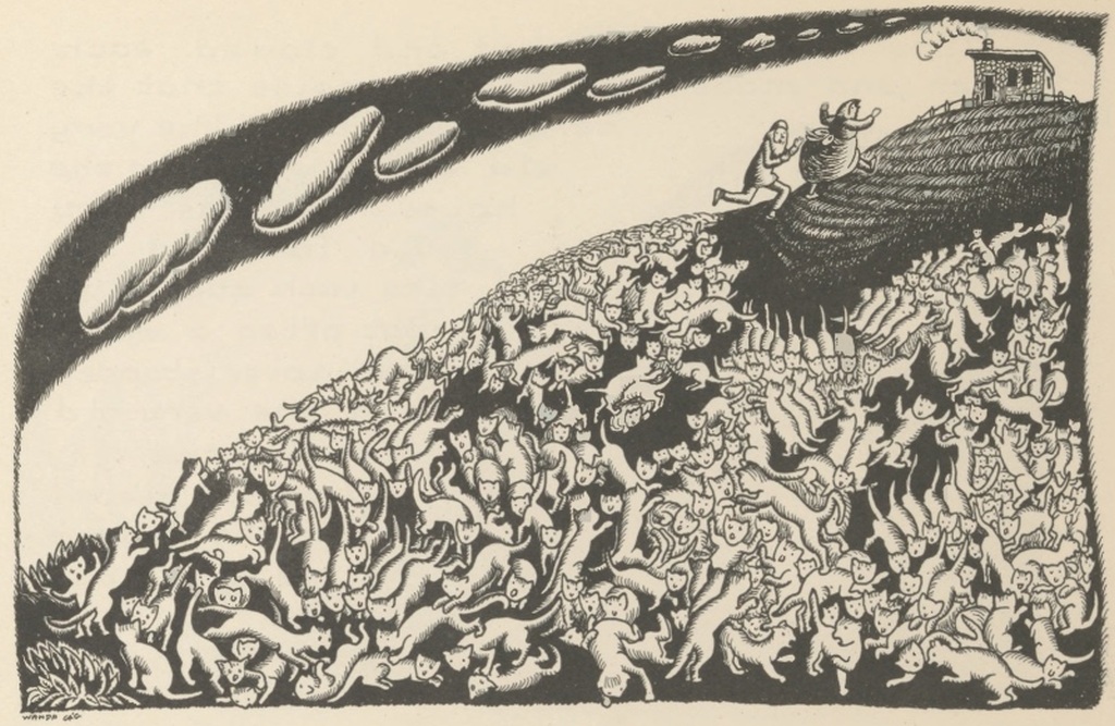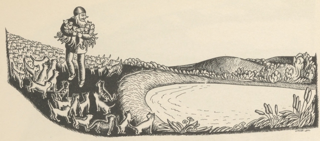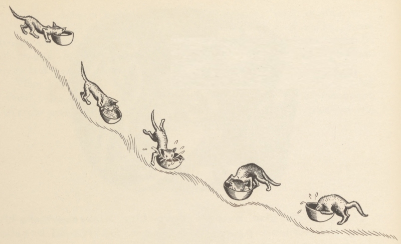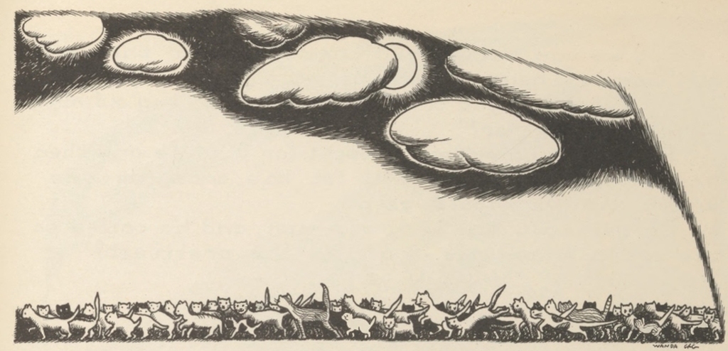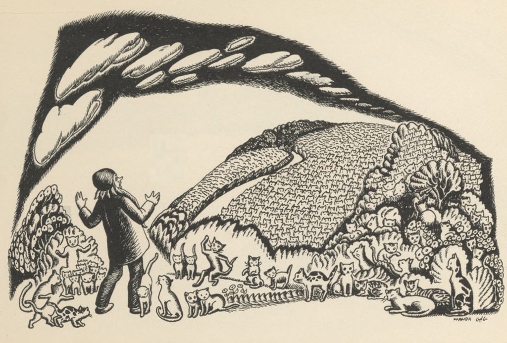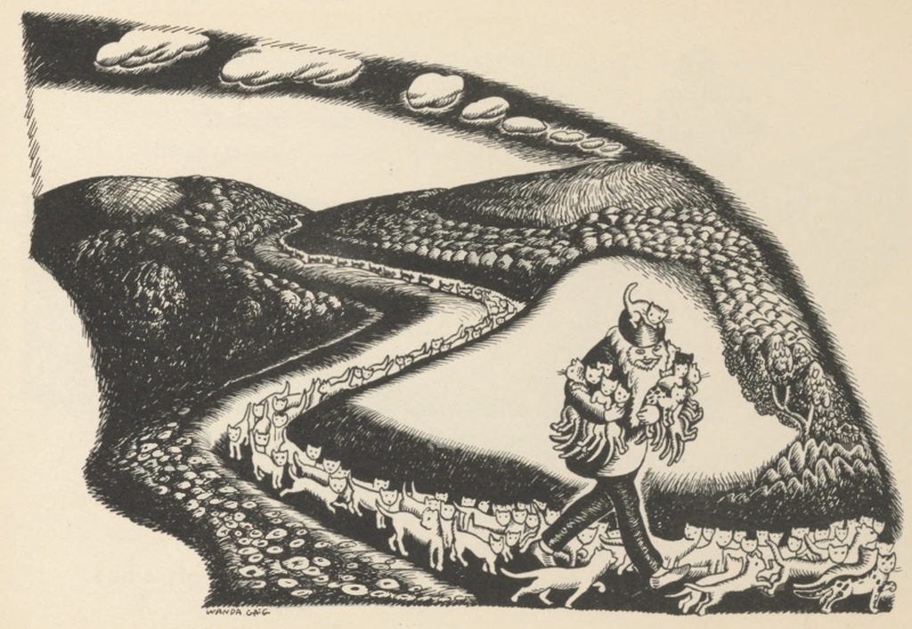 And he set out over the hills to look for one. He climbed over the sunny hills. He trudged through the cool valleys. He walked a long, long time and at last he came to a hill which was quite covered with cats.