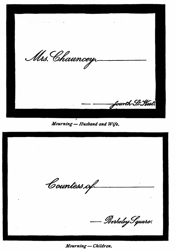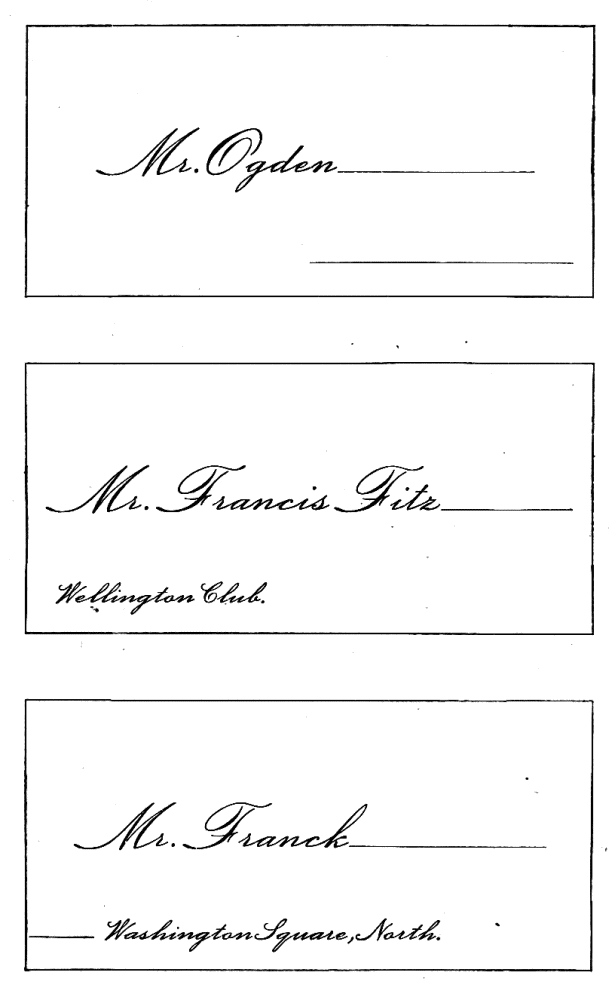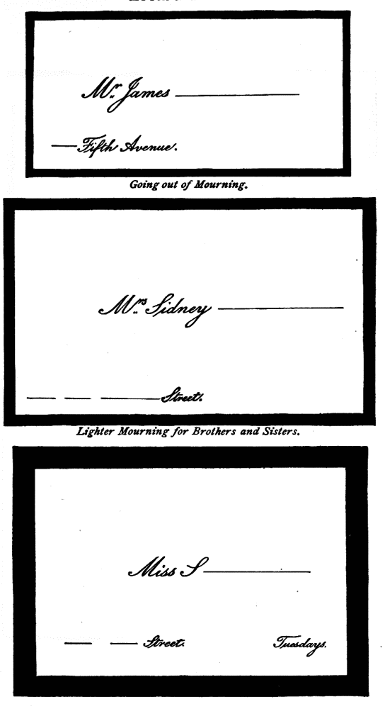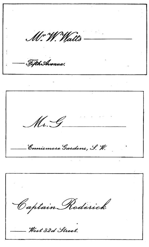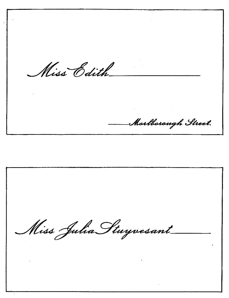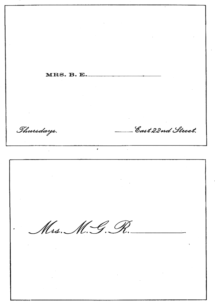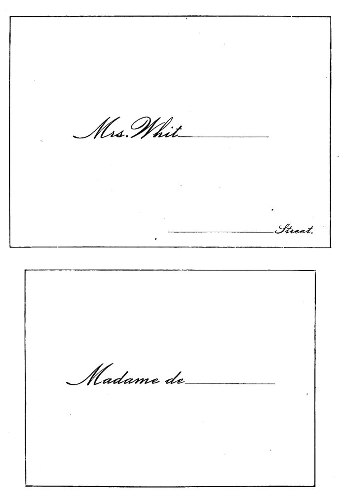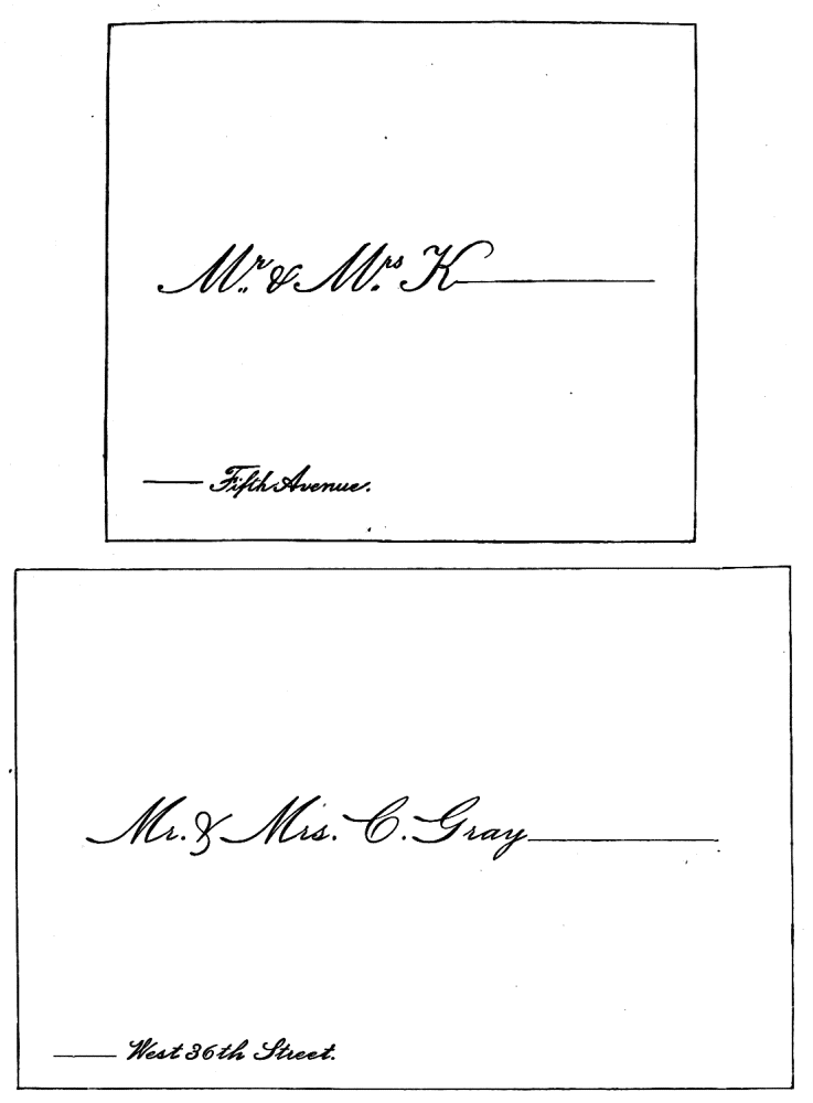Assigning Guests at Dinner—The Boston fashion dying out—The approved Manner—Going in to Dinner—Time to be spent at table—Table Decoration—Too many Flowers in bad taste—Simplicity the best style—Queen Victoria’s table—Her Dinner served at 8.15, but she eats her best meal at 2 P.M.—Being late at Dinner a breach of good Manners—A Dinner acceptance a sacred Obligation—A Visite de digestion, | 291 |