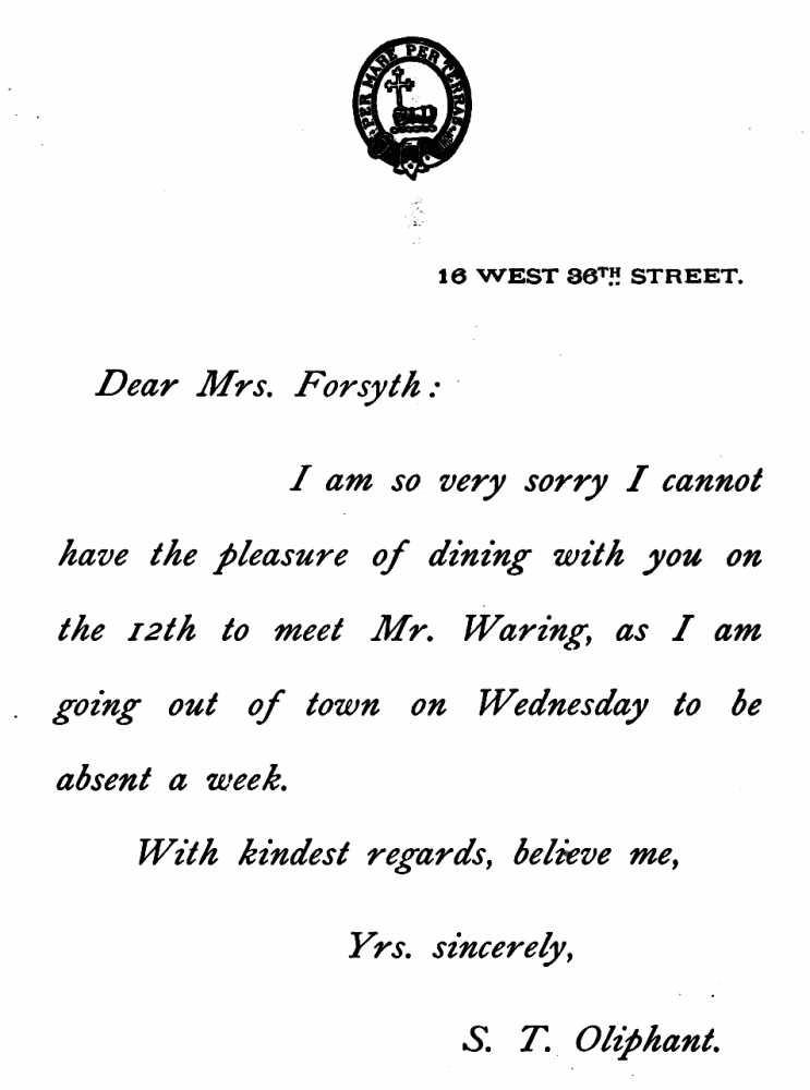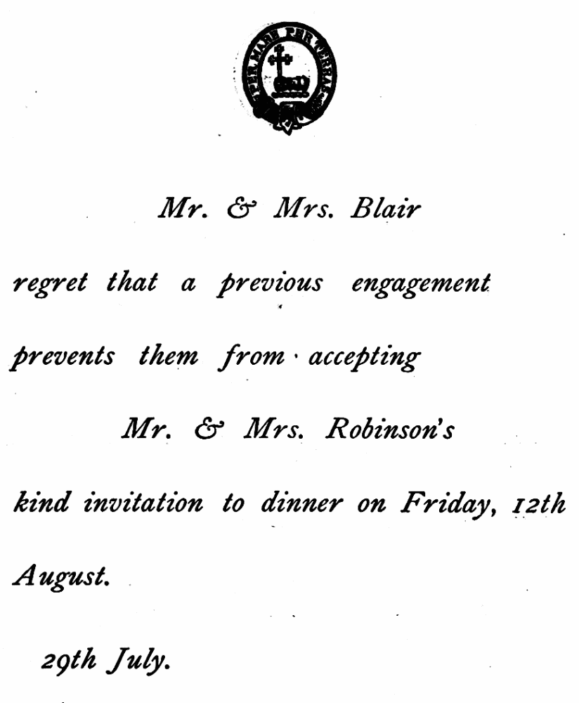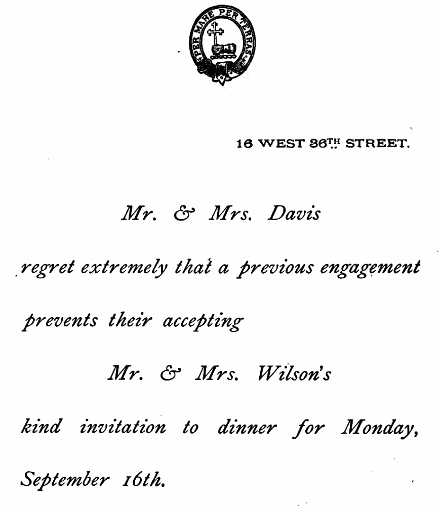 FORMAL REGRET OF INVITATION TO DINNER.