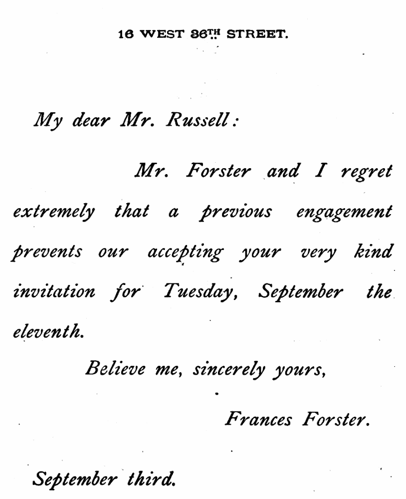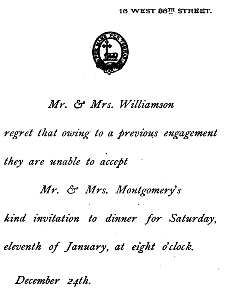 FORMAL REGRET OF INVITATION TO THEATRE PARTY AND SUPPER.