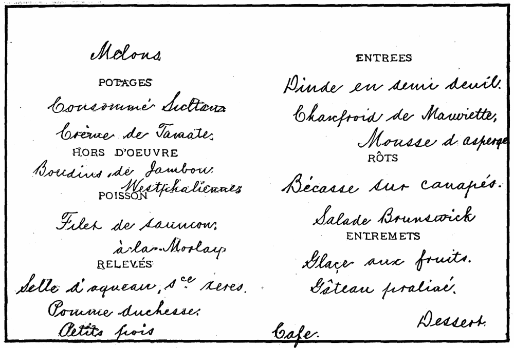 Some practical Questions answered—Difference between Men and Women Cooks—Swedish Women the cleanest and most economical—My Bills with a Chef—My Bills with a Woman Cook—Hints on Marketing—I have done my own Buying for forty years—Mme. Rothschild personally supervises her famous Dinners—Menu of an old-fashioned Southern Dinner—Success of an Impromptu Banquet, | 305 |