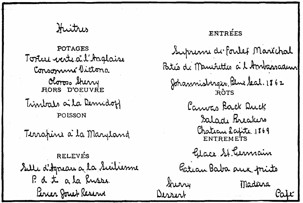 Success in Entertaining—The Art of Dinner-giving—Selection of Guests—A happy Mixture of Young Women and Dowagers—The latter more appreciative of the Good Things—Interviewing the Chef—“Uncle Sam” Ward’s Plan—Mock Turtle Soup a Delusion and a Snare—The Two Styles of cooking Terrapin—Grasshopper-fed Turkeys—Sourbet should not be flavored with Rum—Nesselrode the best of all the Ices, | 255 |