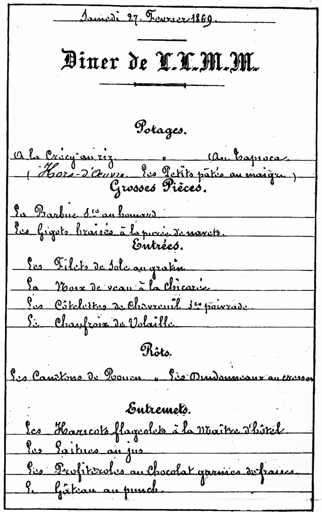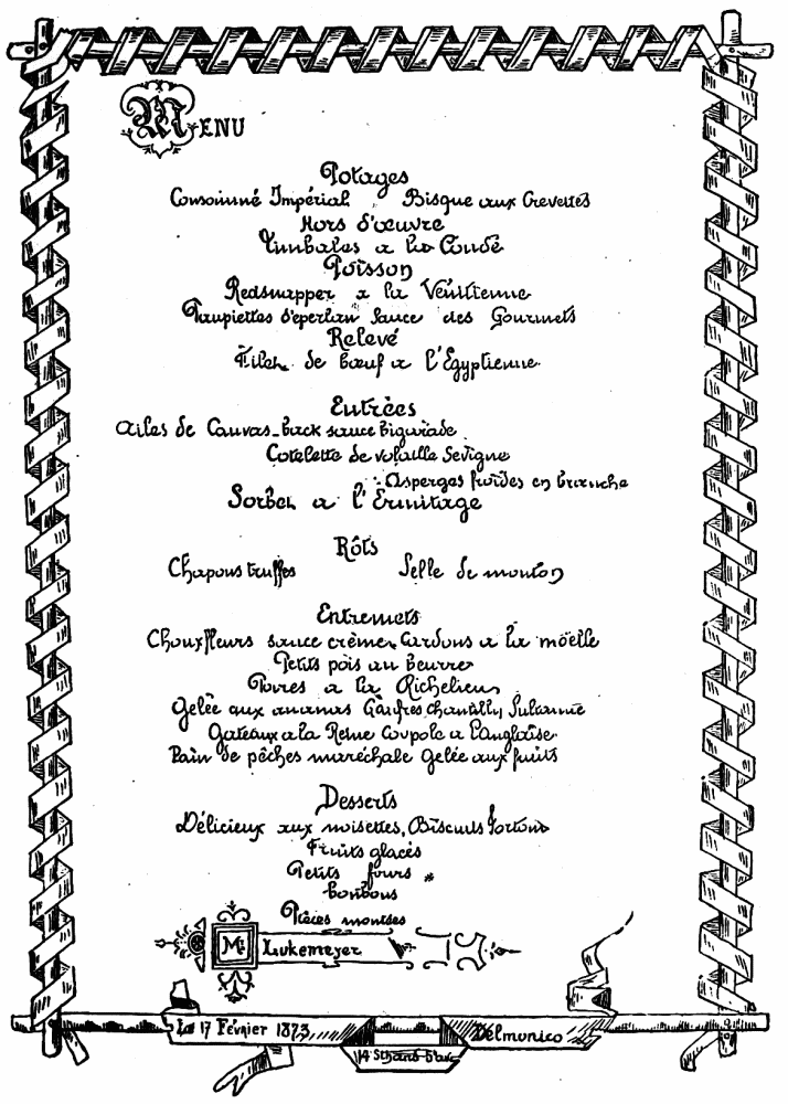 MENU OF THE BANQUET GIVEN THE ATTORNEY-GENERAL BY FREDERICK DIODATI THOMPSON, FEBRUARY 3, 1883.