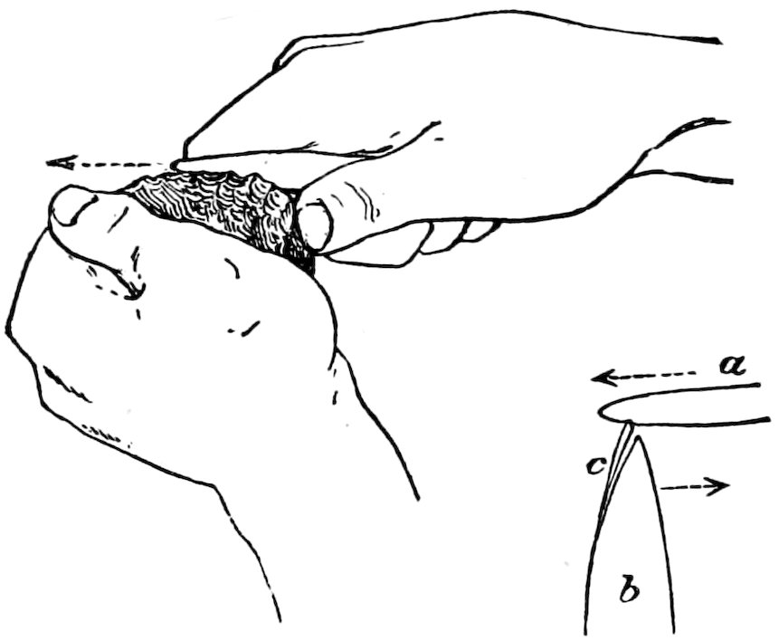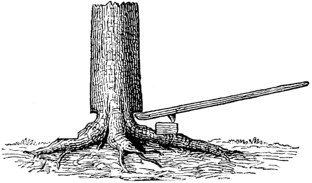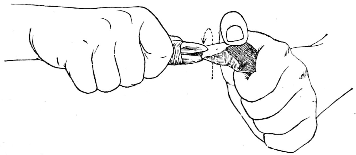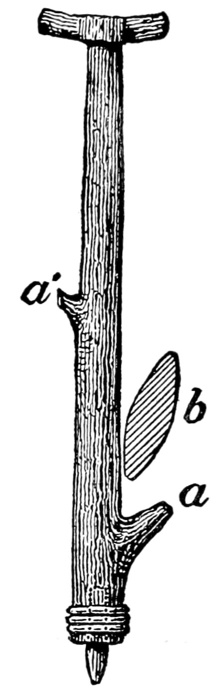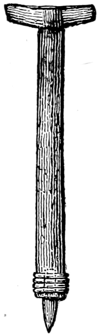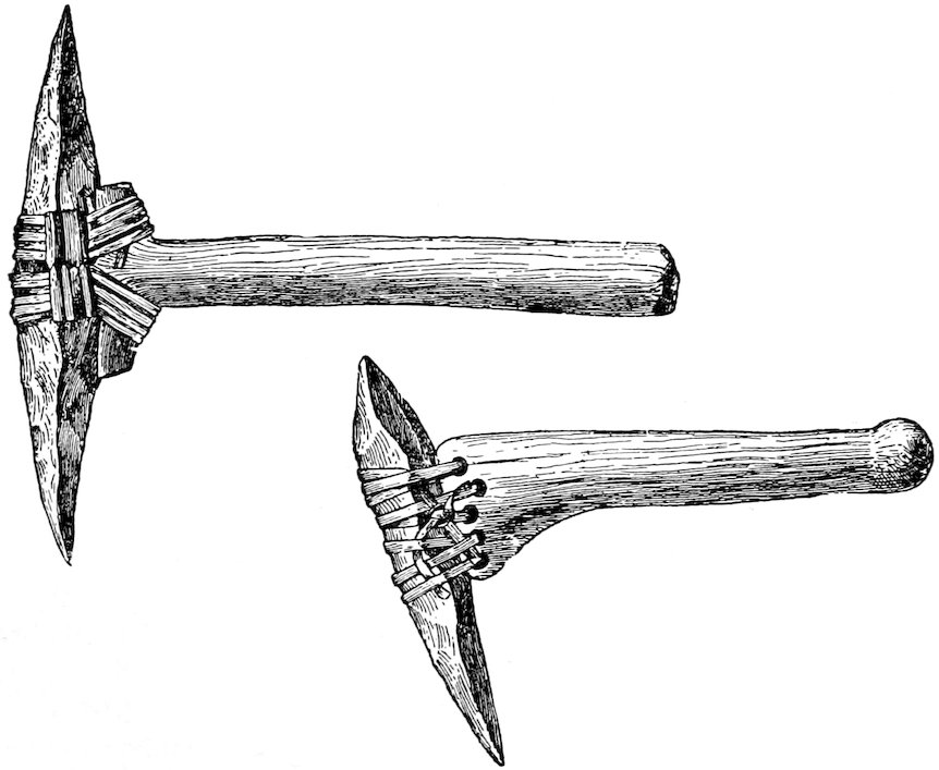 Fig. 4. (S. unknown.) Probable manner of hafting the single-pointed and the two-pointed chisels or picks, used in quarrying flint—in digging the pits. Figs. 4 to 12, and Figs. 36 to 40, are from the 15th Annual Report, Bureau of Ethnology.