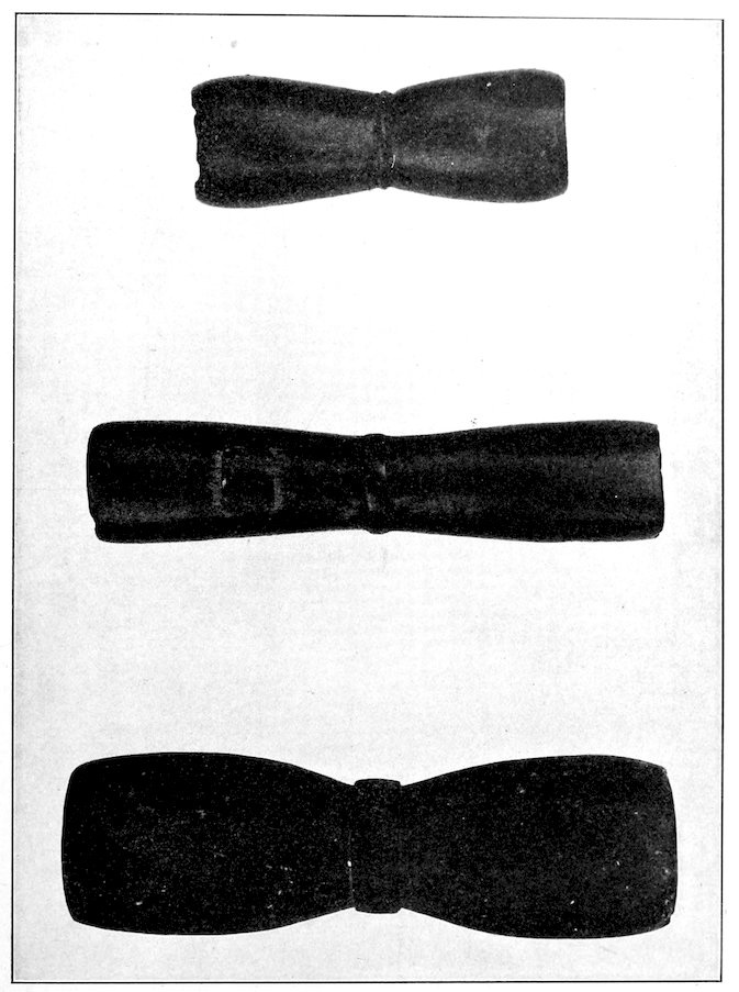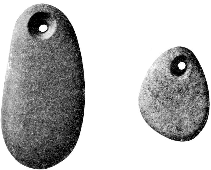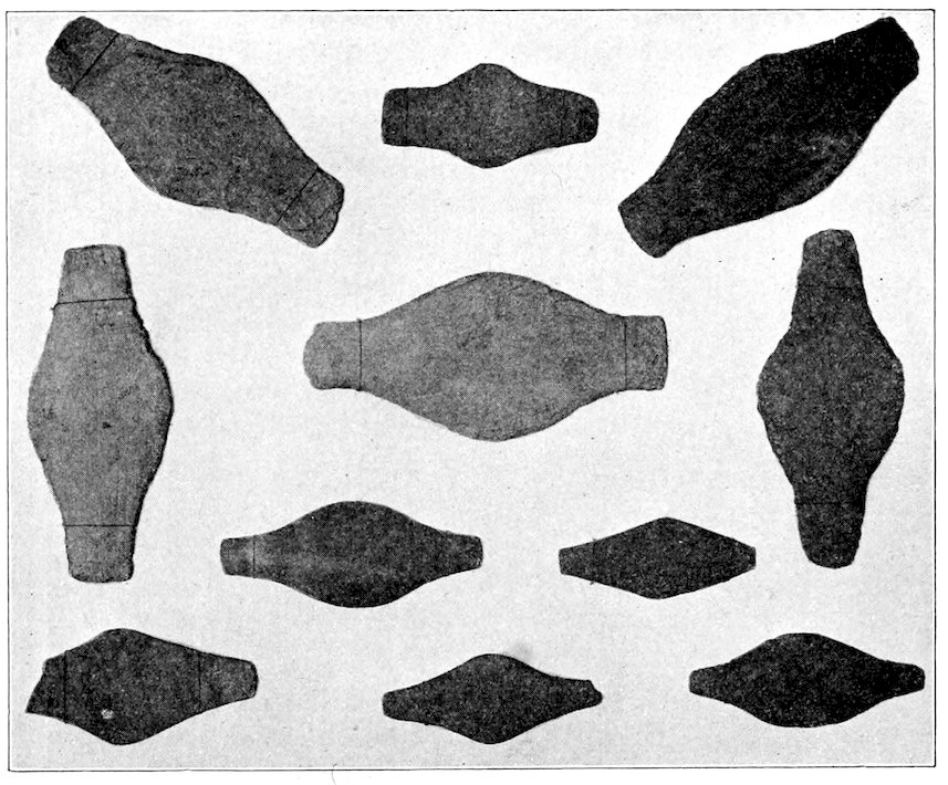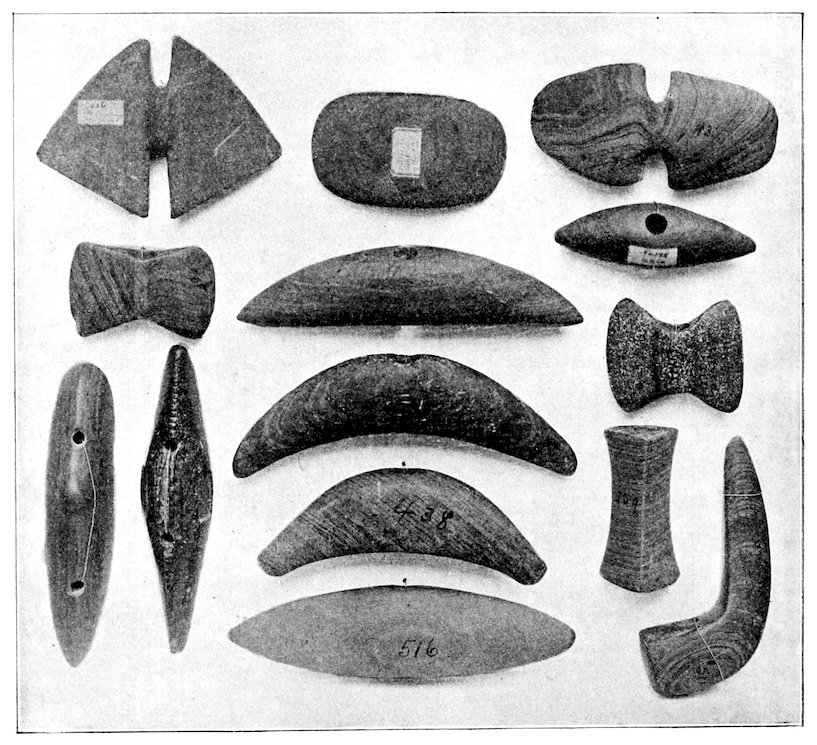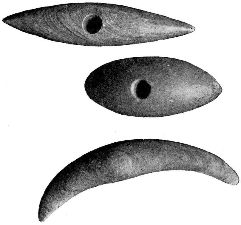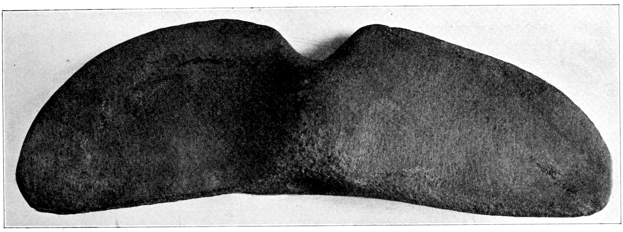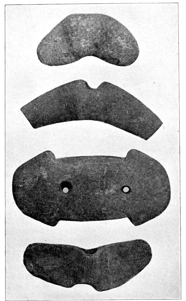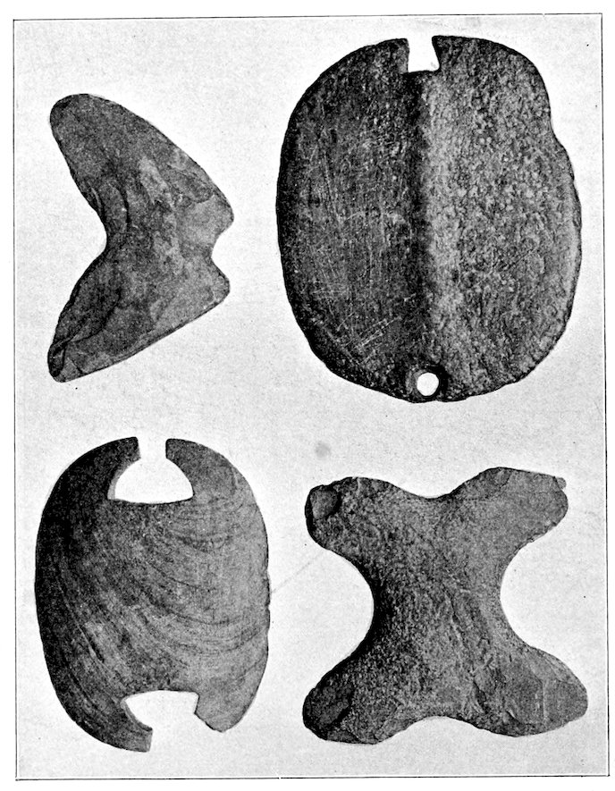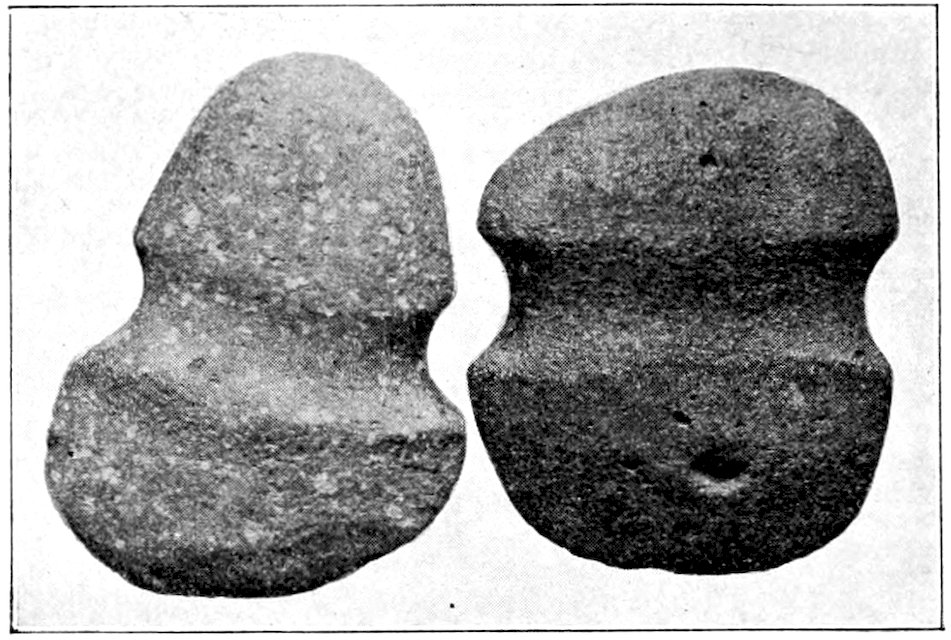 440“So with the perforated stones I am considering. Suppose they were used as net sinkers, or line sinkers, as there is reason to believe they were, and remarkable catches of fish with that net or line would make for the stones the reputation of being ‘lucky.’ Continued successes would transfer them to the realm of veneration—they would become ‘charms.’ They need no longer be fastened to net or line. It would be enough to hang them over the water or from the canoe. Suppose they were used to twist bow-strings; and some were no doubt so used. Unusual success with that bow would sooner or later change the twister into a ‘charm,’ and so on.