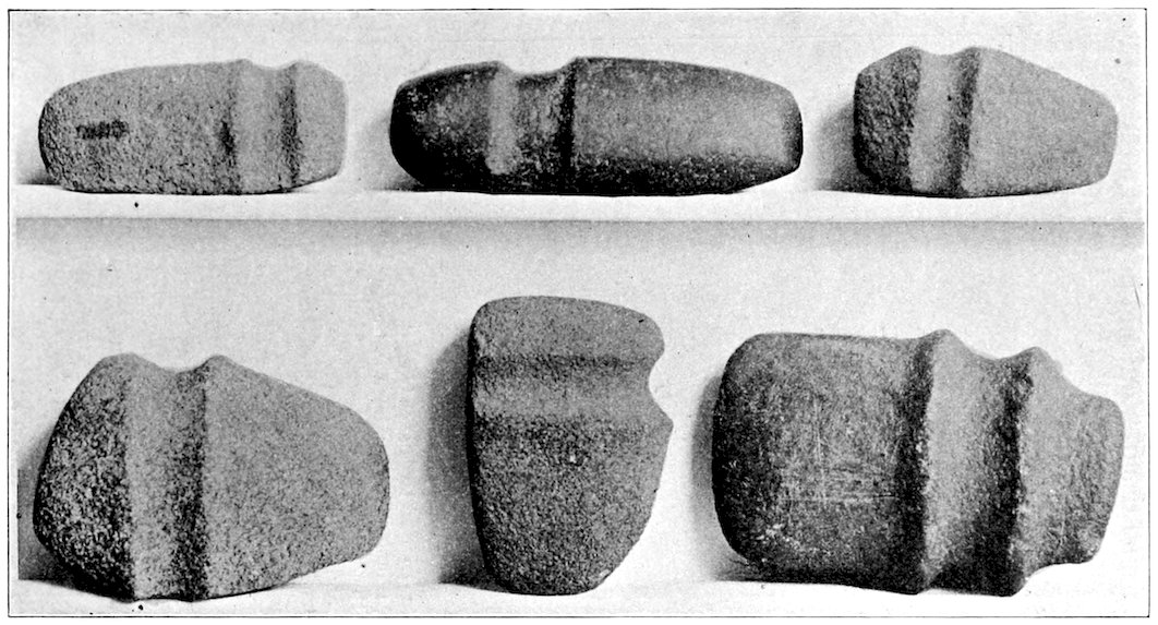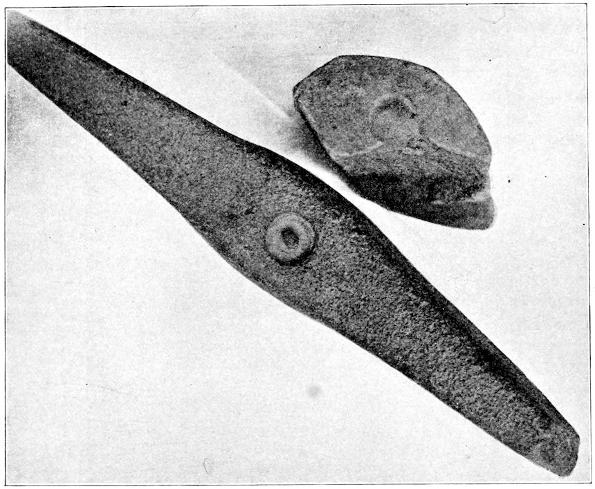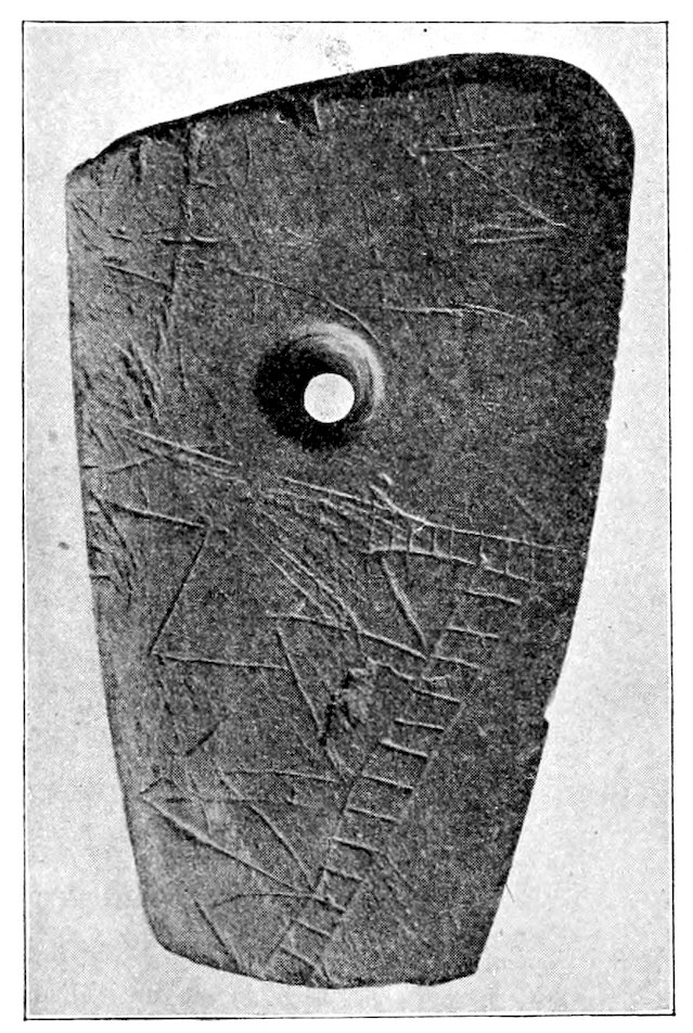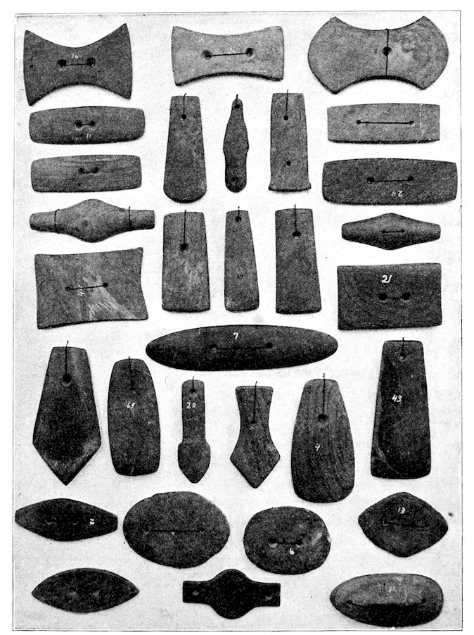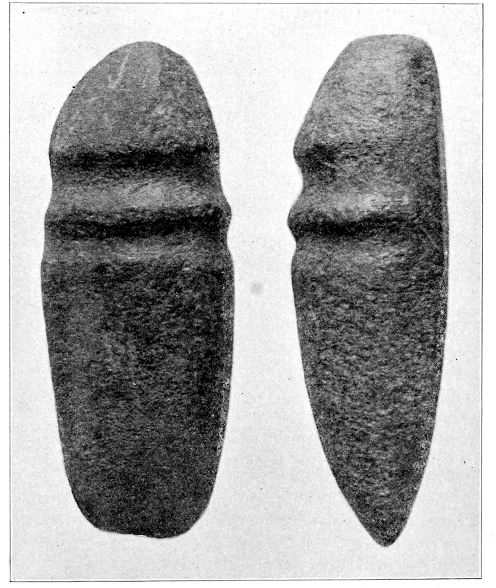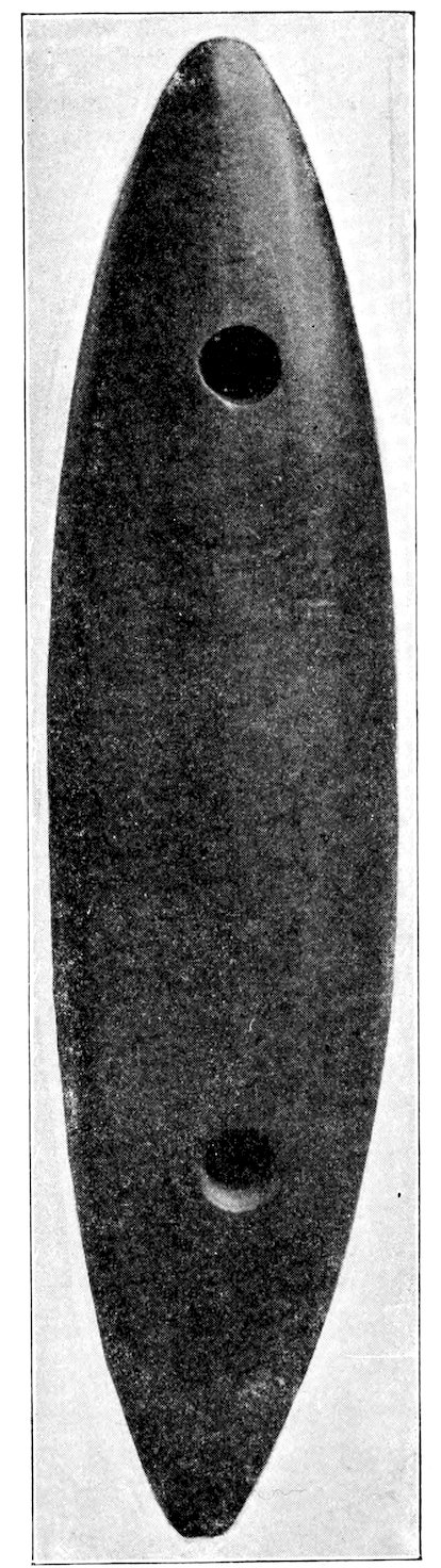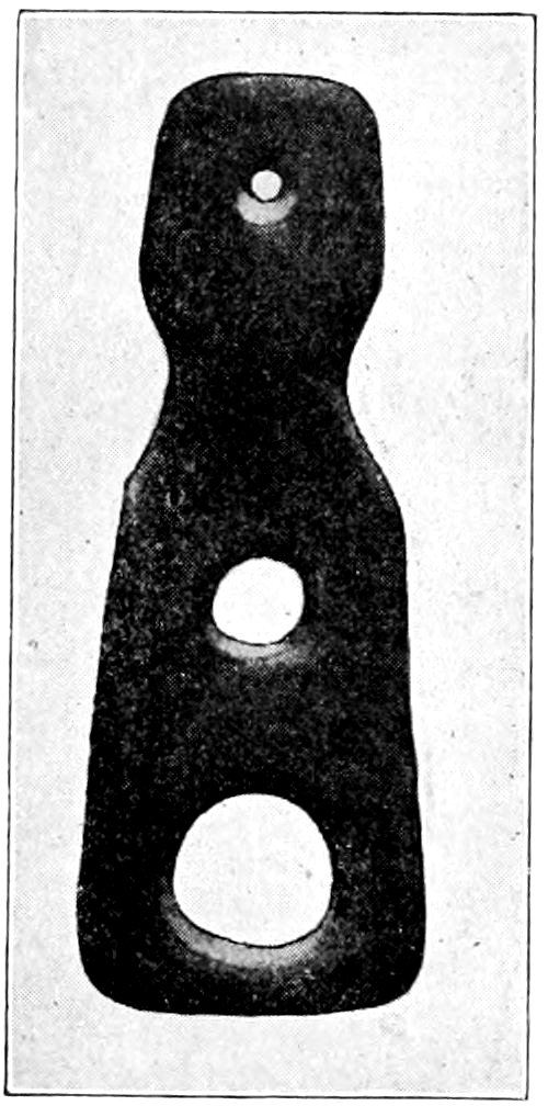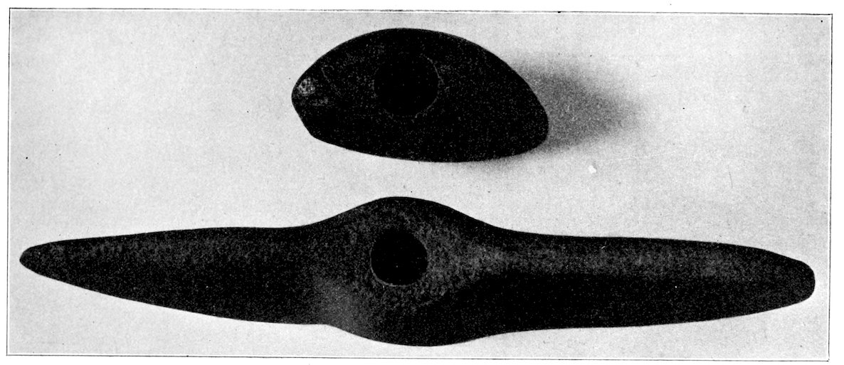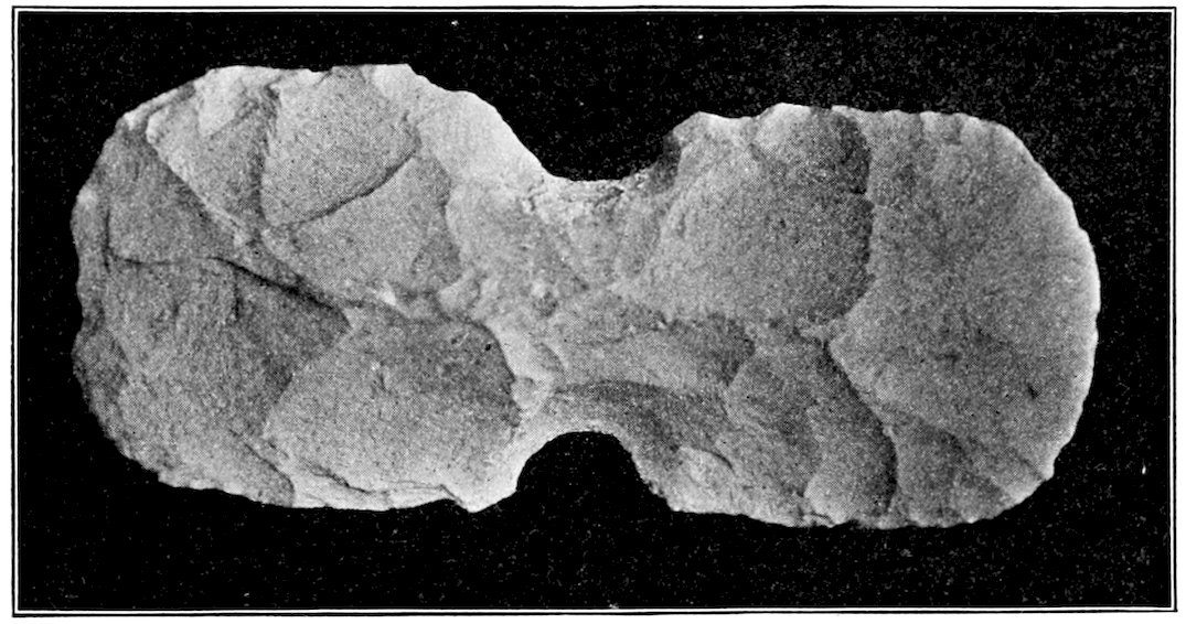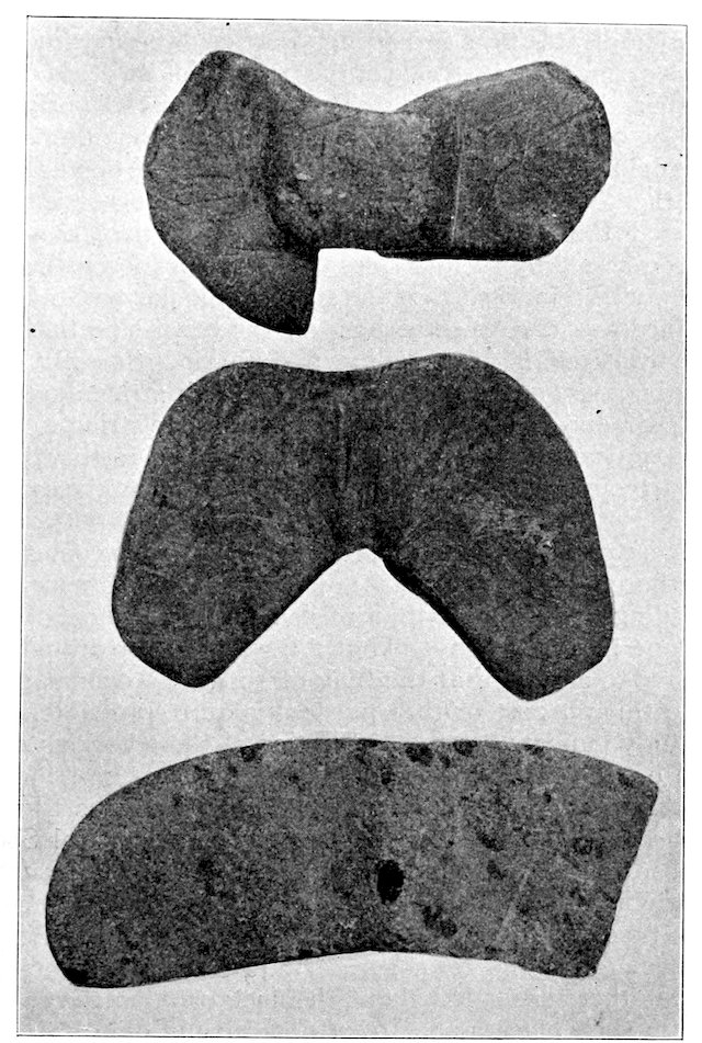 440“So with the perforated stones I am considering. Suppose they were used as net sinkers, or line sinkers, as there is reason to believe they were, and remarkable catches of fish with that net or line would make for the stones the reputation of being ‘lucky.’ Continued successes would transfer them to the realm of veneration—they would become ‘charms.’ They need no longer be fastened to net or line. It would be enough to hang them over the water or from the canoe. Suppose they were used to twist bow-strings; and some were no doubt so used. Unusual success with that bow would sooner or later change the twister into a ‘charm,’ and so on.