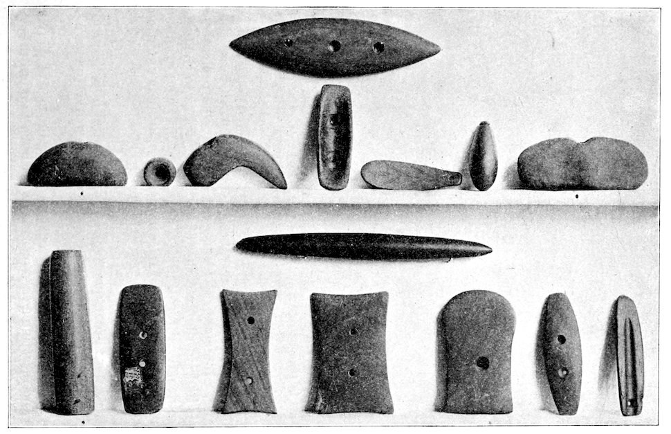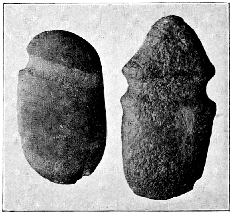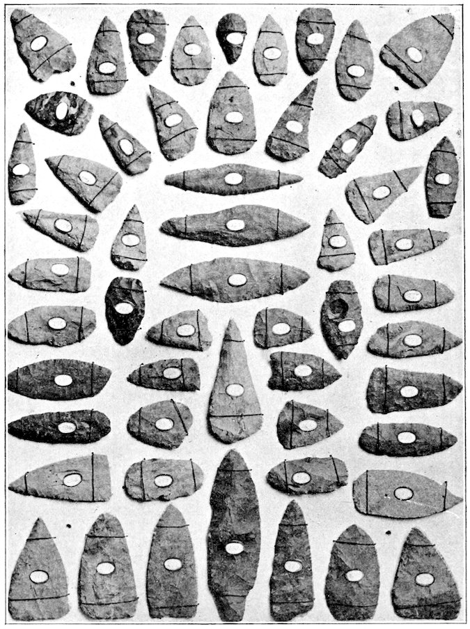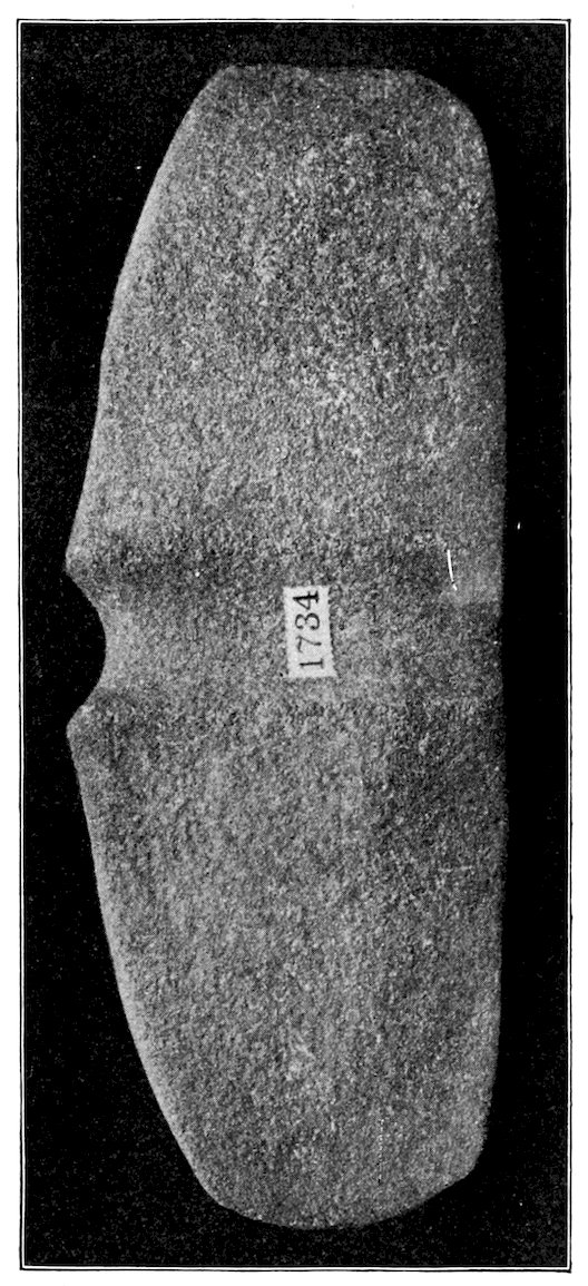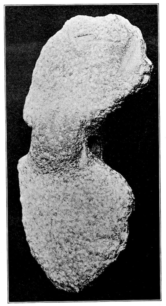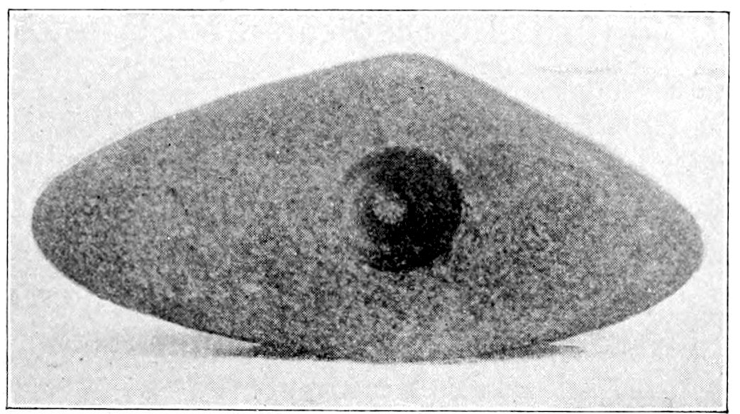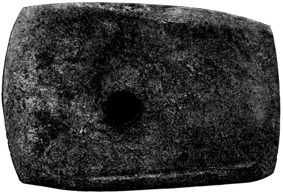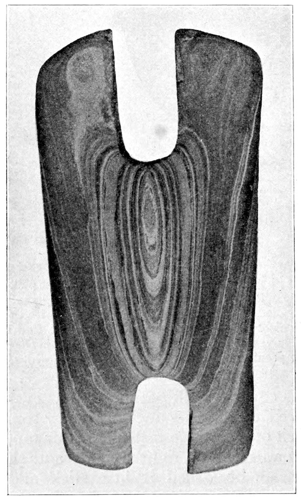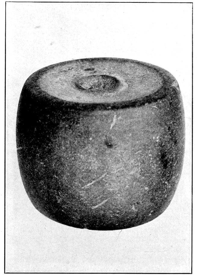 440“So with the perforated stones I am considering. Suppose they were used as net sinkers, or line sinkers, as there is reason to believe they were, and remarkable catches of fish with that net or line would make for the stones the reputation of being ‘lucky.’ Continued successes would transfer them to the realm of veneration—they would become ‘charms.’ They need no longer be fastened to net or line. It would be enough to hang them over the water or from the canoe. Suppose they were used to twist bow-strings; and some were no doubt so used. Unusual success with that bow would sooner or later change the twister into a ‘charm,’ and so on.