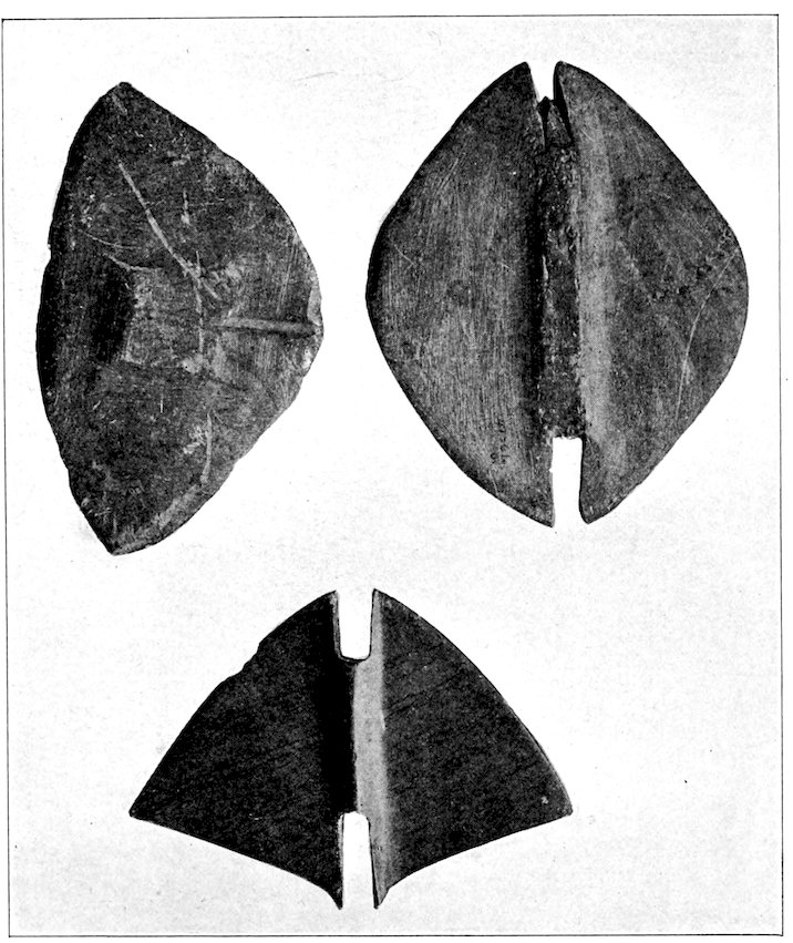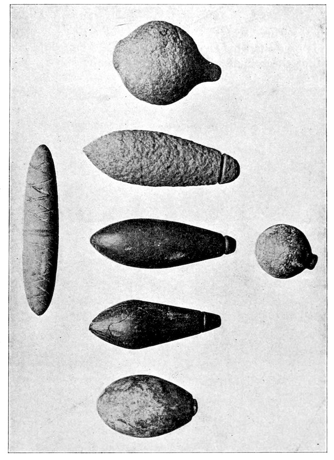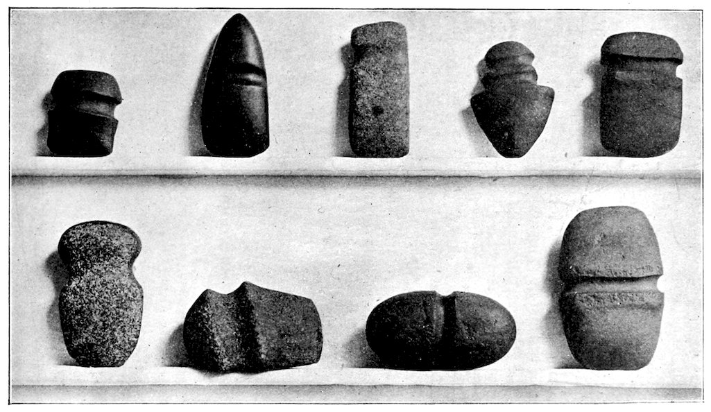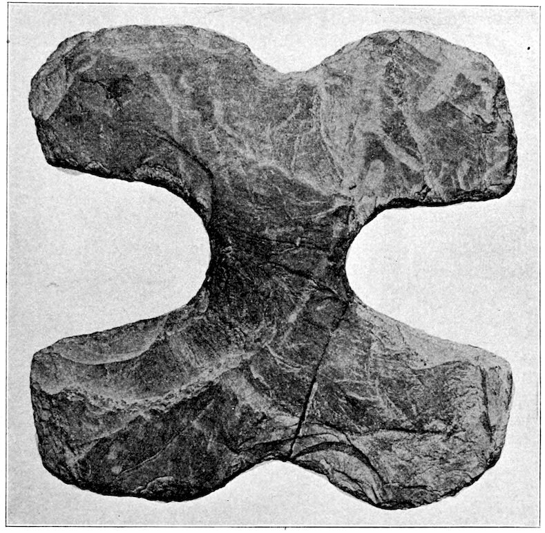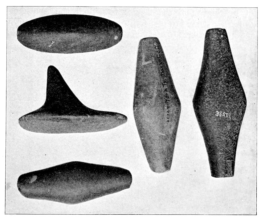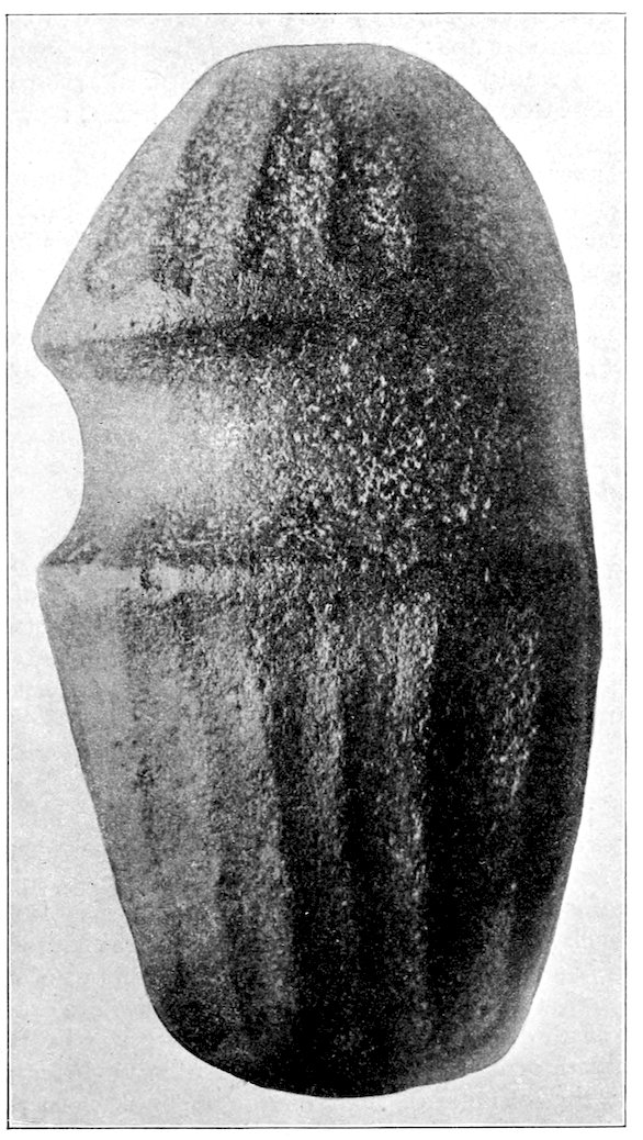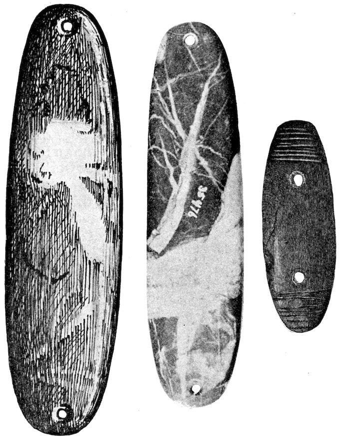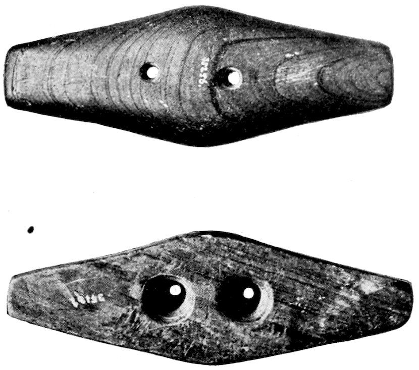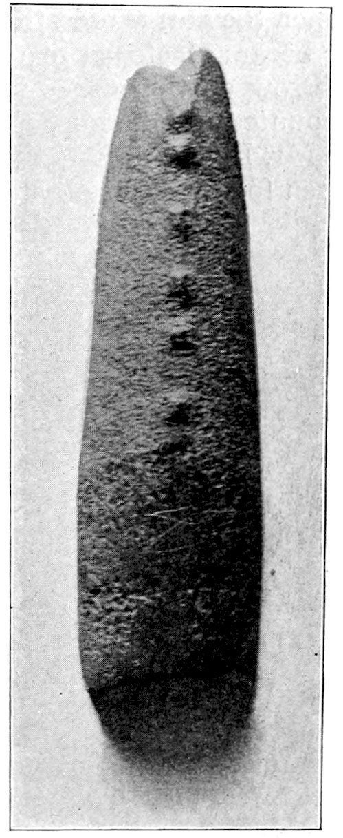 440“So with the perforated stones I am considering. Suppose they were used as net sinkers, or line sinkers, as there is reason to believe they were, and remarkable catches of fish with that net or line would make for the stones the reputation of being ‘lucky.’ Continued successes would transfer them to the realm of veneration—they would become ‘charms.’ They need no longer be fastened to net or line. It would be enough to hang them over the water or from the canoe. Suppose they were used to twist bow-strings; and some were no doubt so used. Unusual success with that bow would sooner or later change the twister into a ‘charm,’ and so on.
