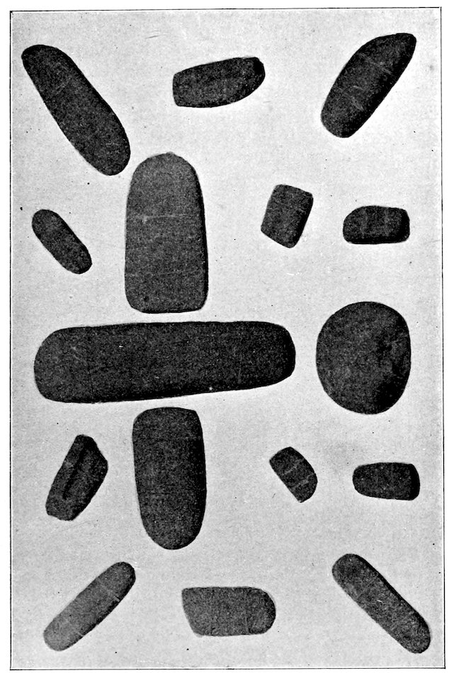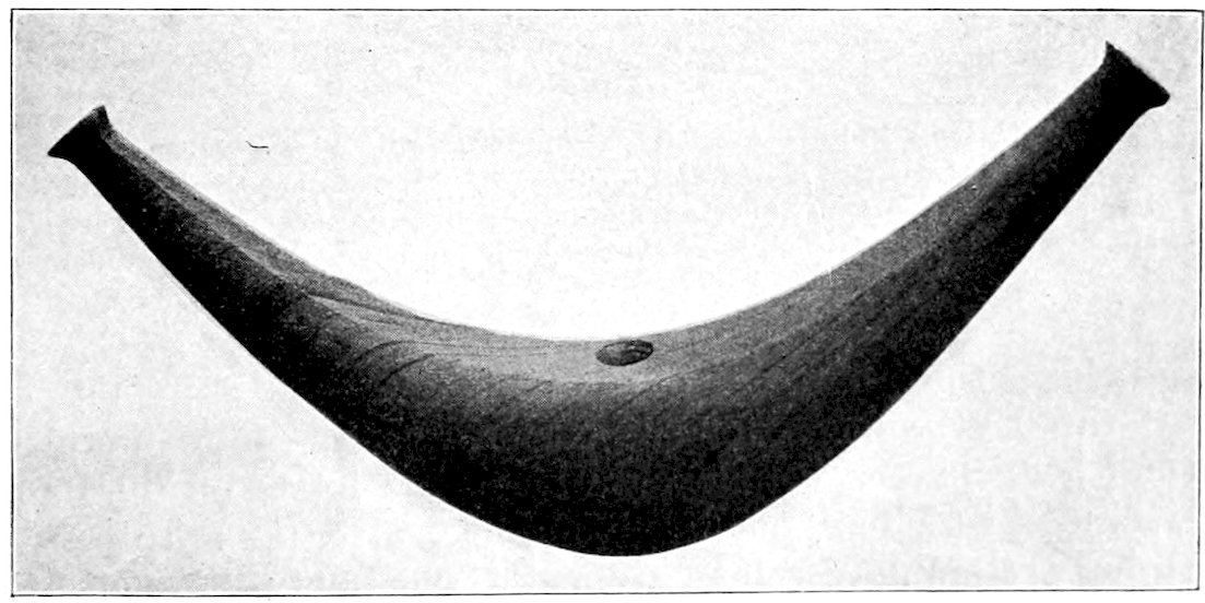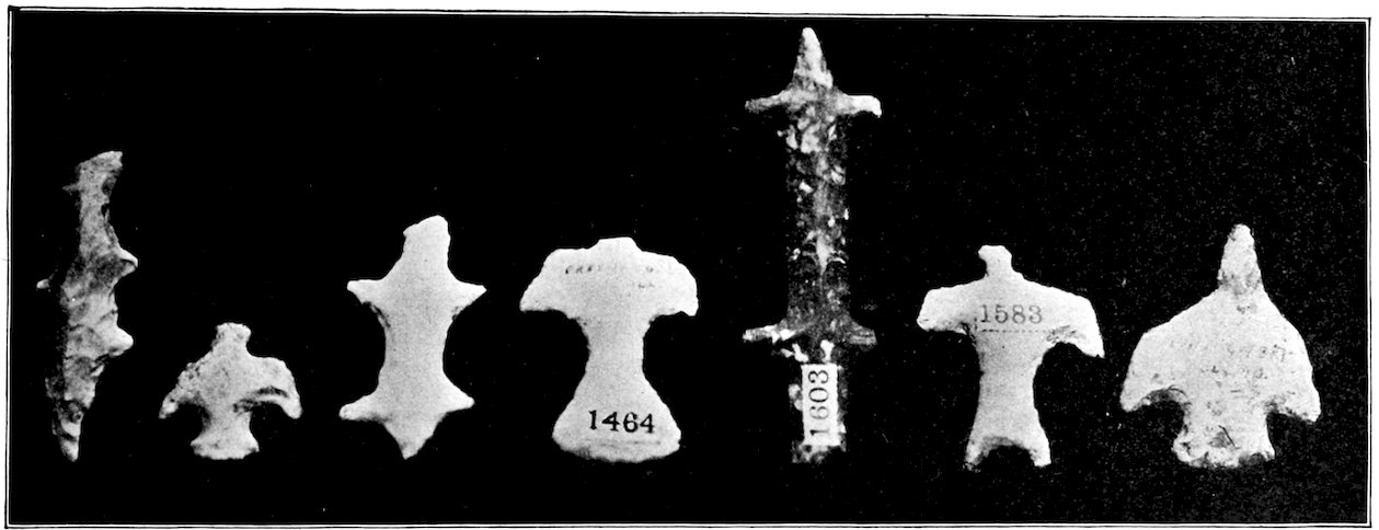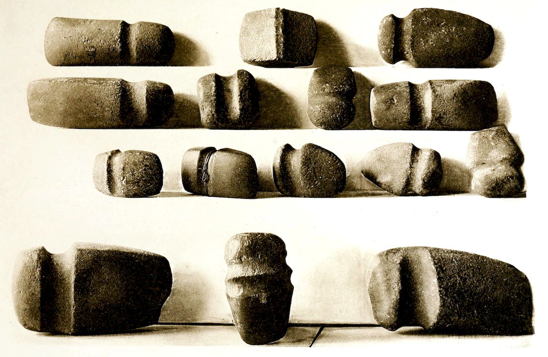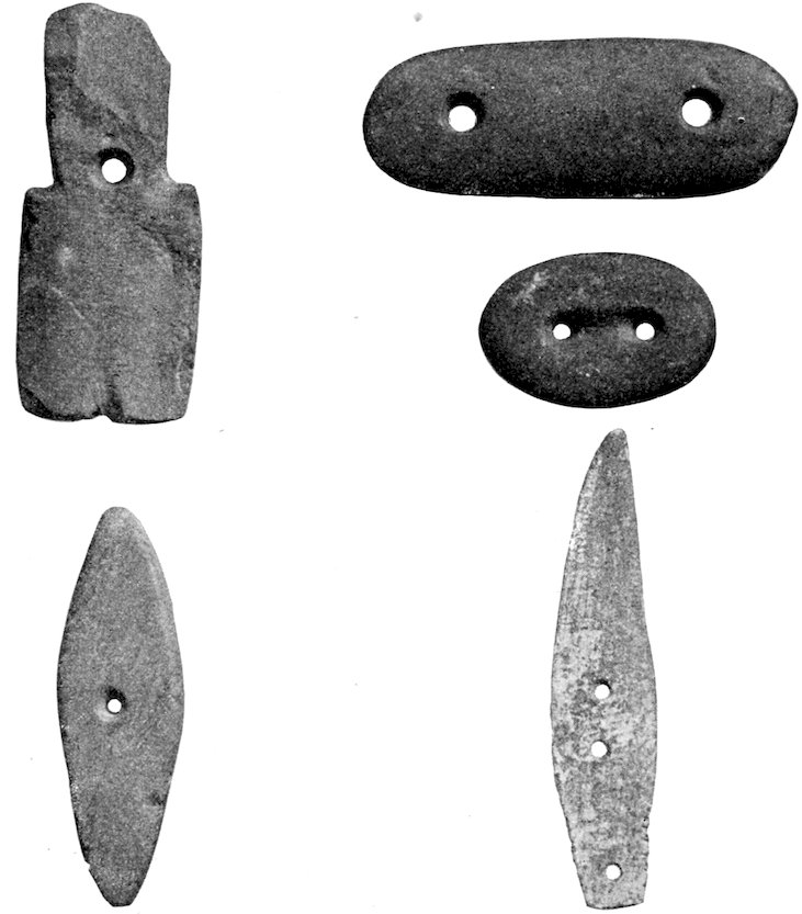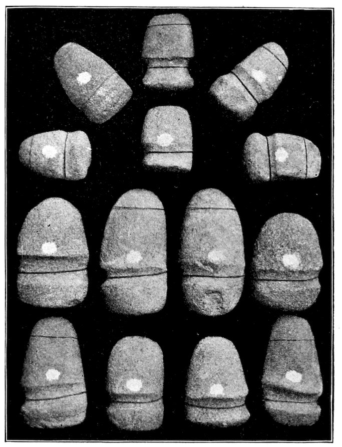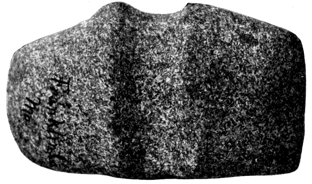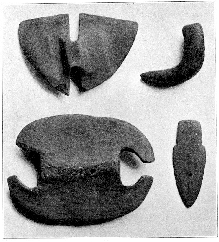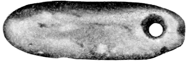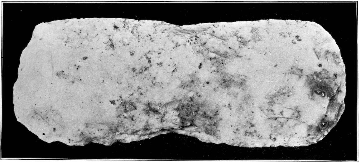 440“So with the perforated stones I am considering. Suppose they were used as net sinkers, or line sinkers, as there is reason to believe they were, and remarkable catches of fish with that net or line would make for the stones the reputation of being ‘lucky.’ Continued successes would transfer them to the realm of veneration—they would become ‘charms.’ They need no longer be fastened to net or line. It would be enough to hang them over the water or from the canoe. Suppose they were used to twist bow-strings; and some were no doubt so used. Unusual success with that bow would sooner or later change the twister into a ‘charm,’ and so on.