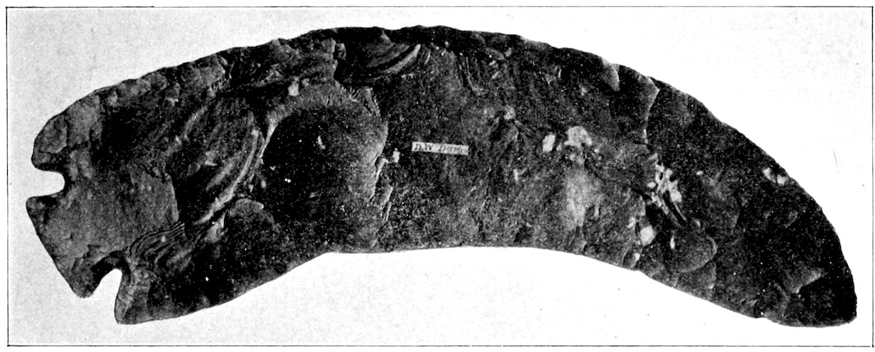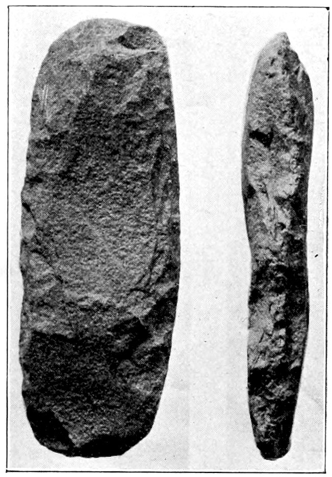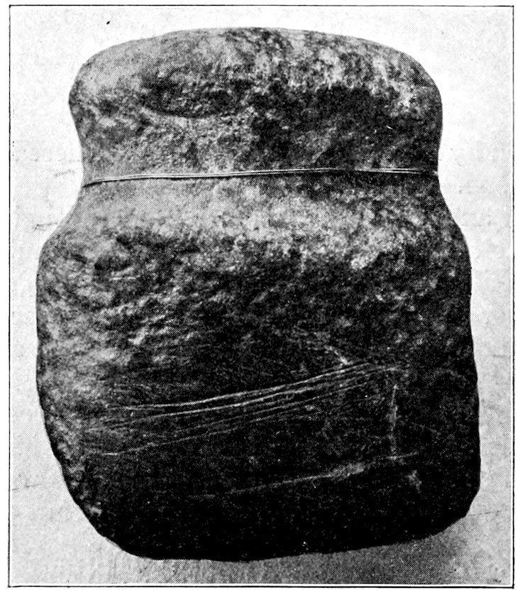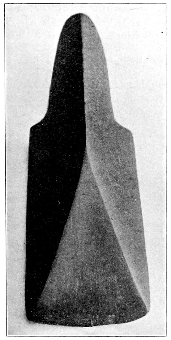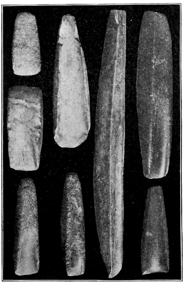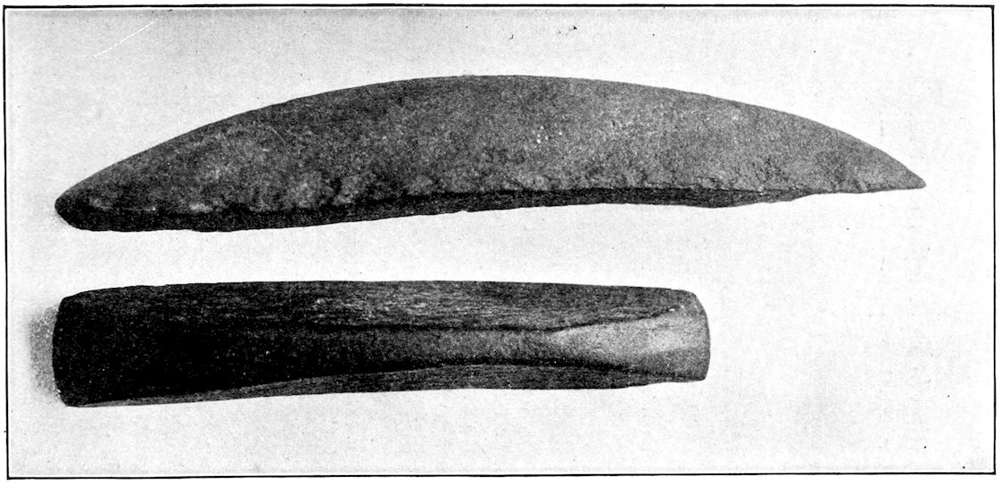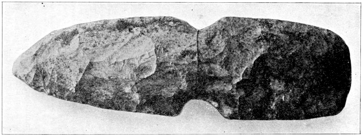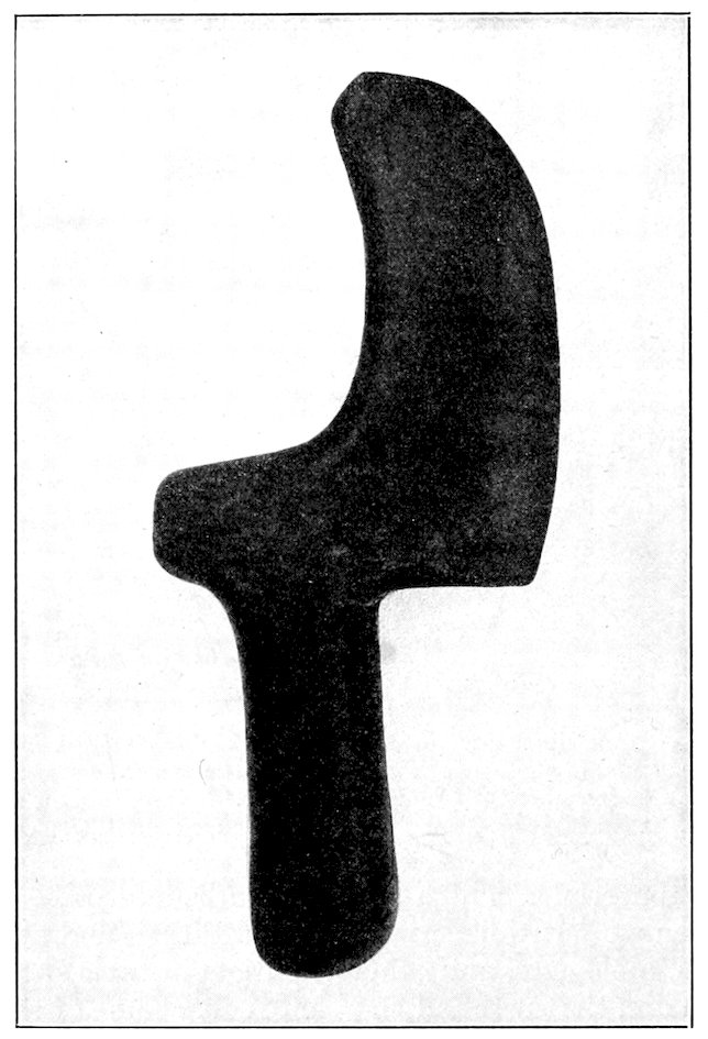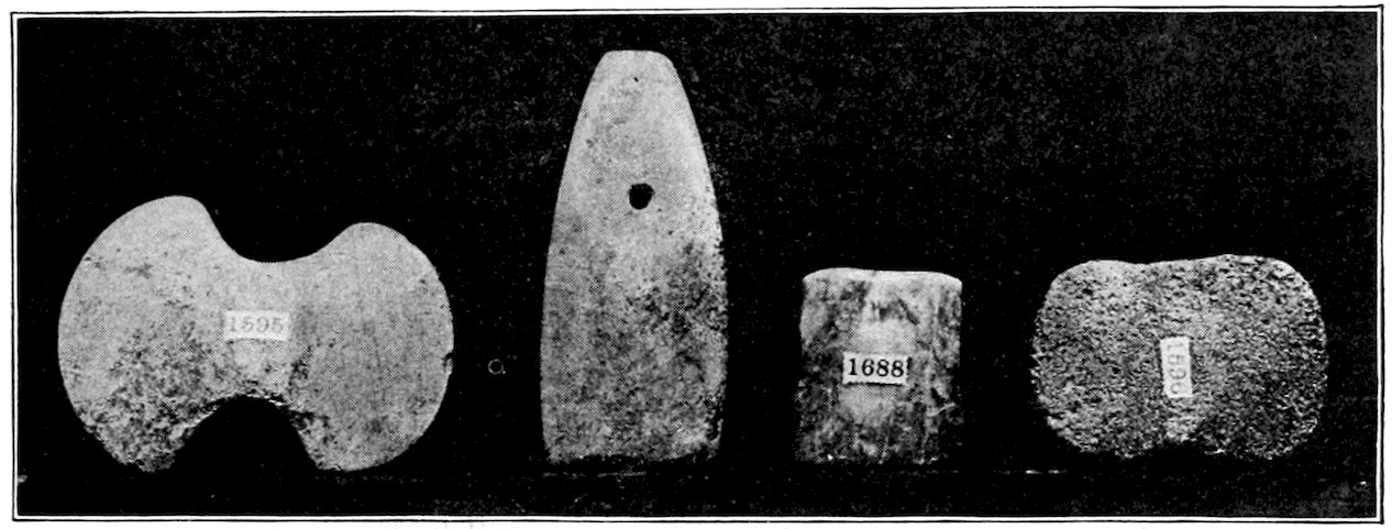 In the “Handbook” the writers have concentrated their attention upon the life of the American Indian as seen through the eyes and conceived by the brains of those familiar with Indian history of the past two centuries. Under various citations are axes, arrows, copper objects, and other artifacts treated. But these must be necessarily brief, excellent though they are. And I speak in no hostile criticism whatsoever in stating that the “Handbook of American Indians” could not take up these subjects in detail. While I highly recommend the “Handbook of American Indians,” I am persuaded that the life of the Indian of to-day is influenced by his contact with the white people; that he has drifted far away from Stone-Age times; that while there were examples of real aboriginal culture to be found in America during the past century, yet the great bulk of the natives of this country passed out of the Stone Age with the advent of the French into Canada, the Spaniards into the South, and the Puritans into New England. It seems to me that the study of all these learned individuals, the results of which are set forth in the Indian “Handbook,” has led many of them to consider prehistoric life in America as nearly the same as the life of our Indians for the past one or two centuries. I cannot believe that the arts of the past are the same to any appreciable extent as those which obtained at the time of the Lewis and Clark expedition, and I am convinced that the tribes living at the time of Lewis and Clark practiced arts which are to-day, if not extinct, at least greatly inferior to those of ancient times. Furthermore, I do not believe that the ceremonies practiced by the tribes of to-day are of special value in measuring or understanding prehistoric life.