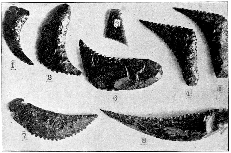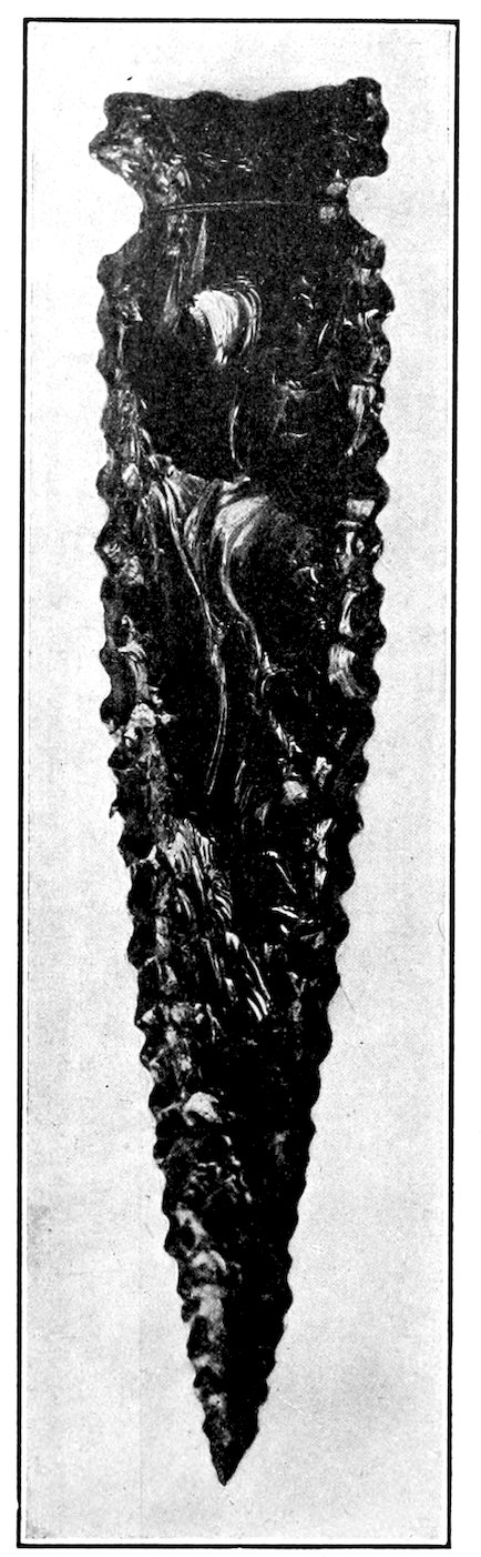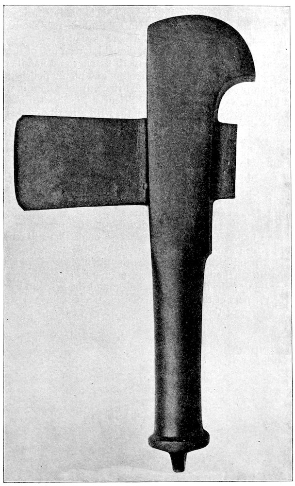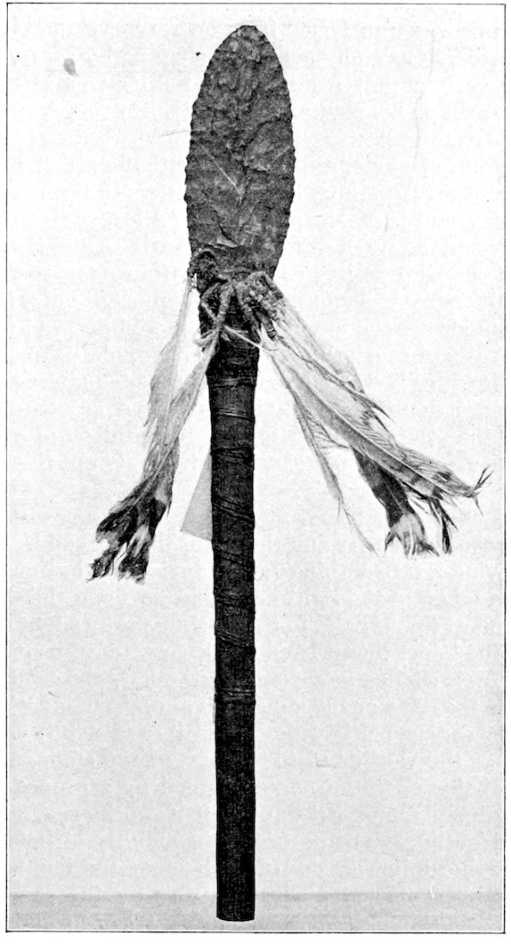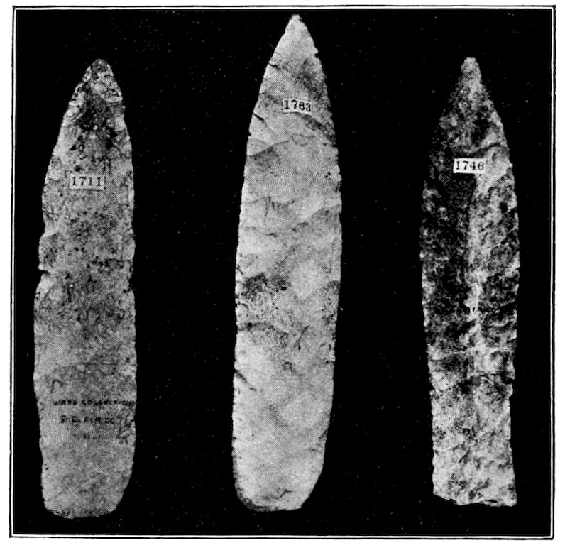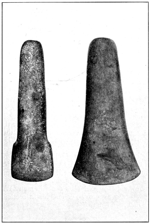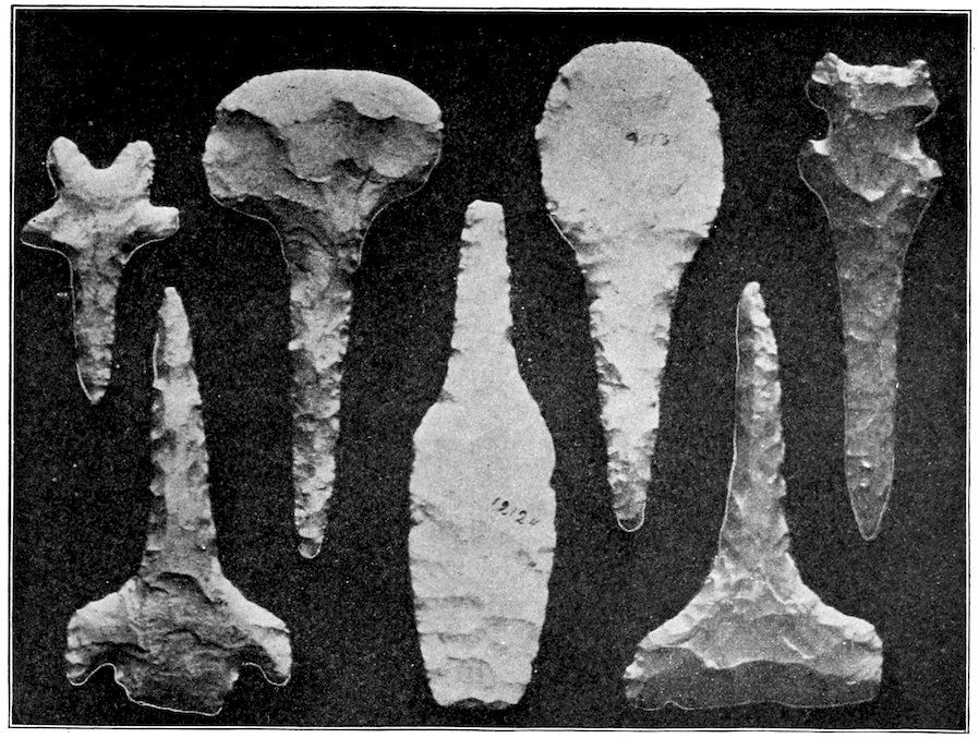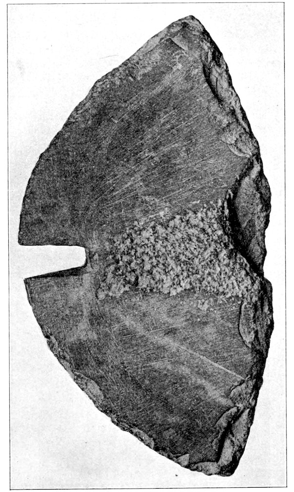 In the “Handbook” the writers have concentrated their attention upon the life of the American Indian as seen through the eyes and conceived by the brains of those familiar with Indian history of the past two centuries. Under various citations are axes, arrows, copper objects, and other artifacts treated. But these must be necessarily brief, excellent though they are. And I speak in no hostile criticism whatsoever in stating that the “Handbook of American Indians” could not take up these subjects in detail. While I highly recommend the “Handbook of American Indians,” I am persuaded that the life of the Indian of to-day is influenced by his contact with the white people; that he has drifted far away from Stone-Age times; that while there were examples of real aboriginal culture to be found in America during the past century, yet the great bulk of the natives of this country passed out of the Stone Age with the advent of the French into Canada, the Spaniards into the South, and the Puritans into New England. It seems to me that the study of all these learned individuals, the results of which are set forth in the Indian “Handbook,” has led many of them to consider prehistoric life in America as nearly the same as the life of our Indians for the past one or two centuries. I cannot believe that the arts of the past are the same to any appreciable extent as those which obtained at the time of the Lewis and Clark expedition, and I am convinced that the tribes living at the time of Lewis and Clark practiced arts which are to-day, if not extinct, at least greatly inferior to those of ancient times. Furthermore, I do not believe that the ceremonies practiced by the tribes of to-day are of special value in measuring or understanding prehistoric life.