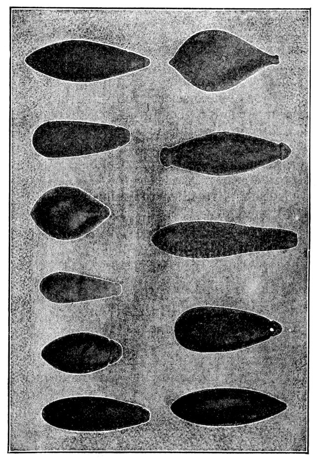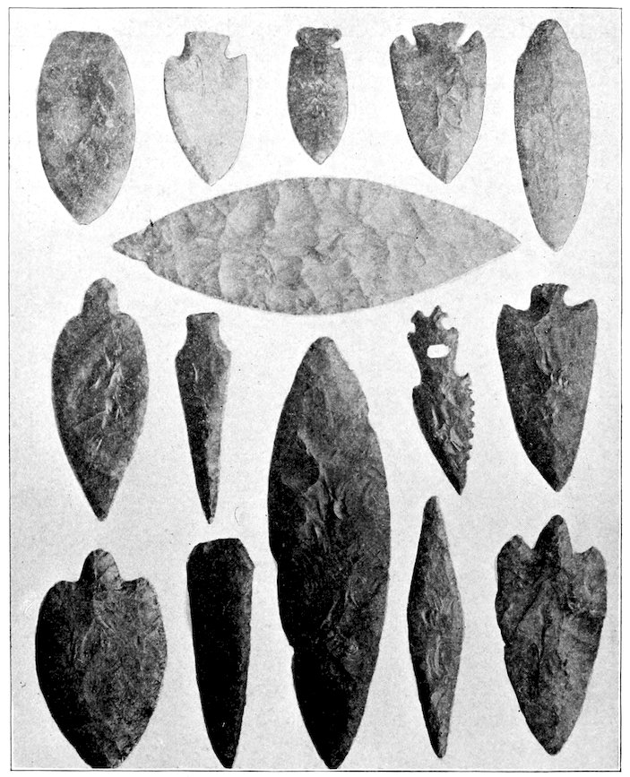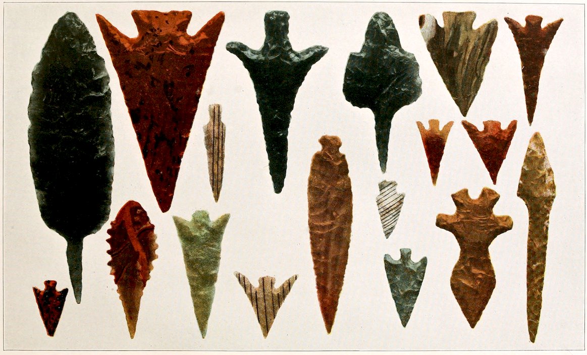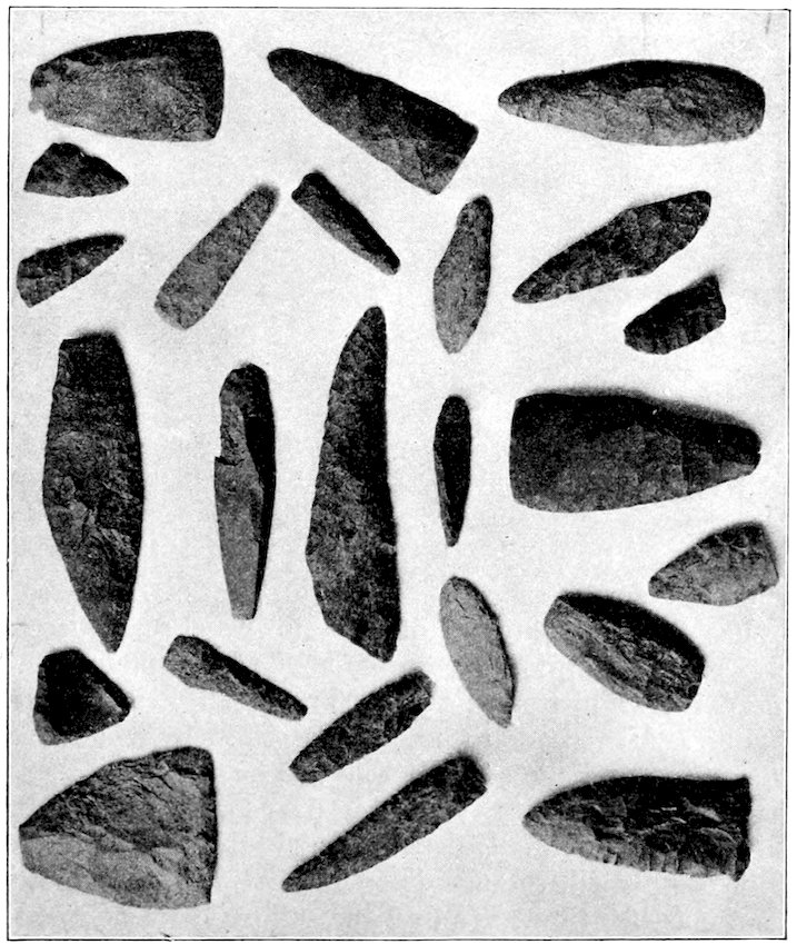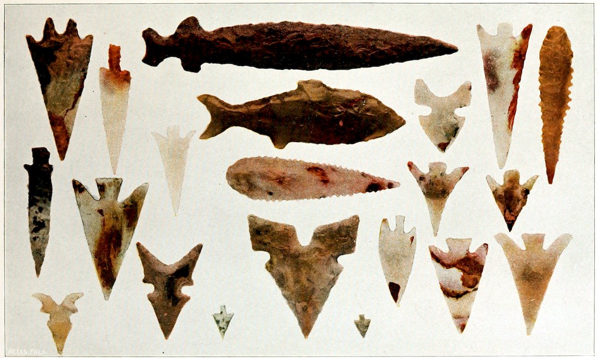 Colored plate of fine chipped implements. Materials: jasper, carnelian, agate, obsidian, and chalcedony. These were collected in the Willamette Valley, Oregon, and are selected as indicative of aboriginal American art in flint-chipping. B. W. Arnold’s collection, Albany, New York.