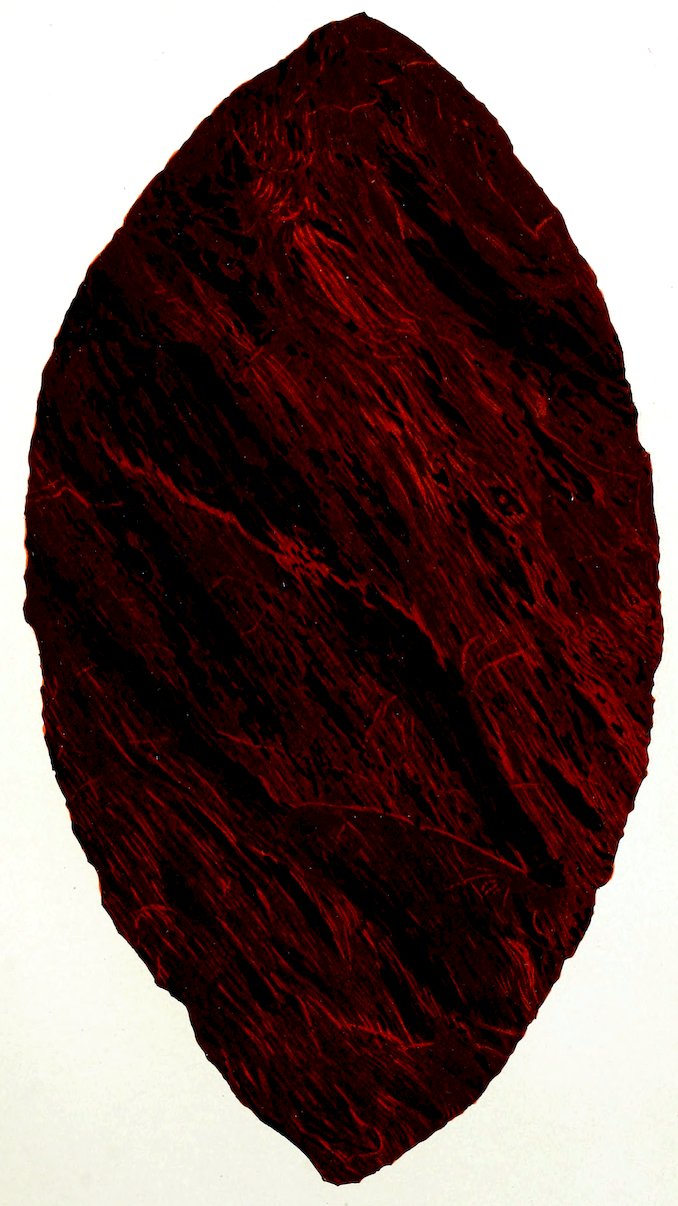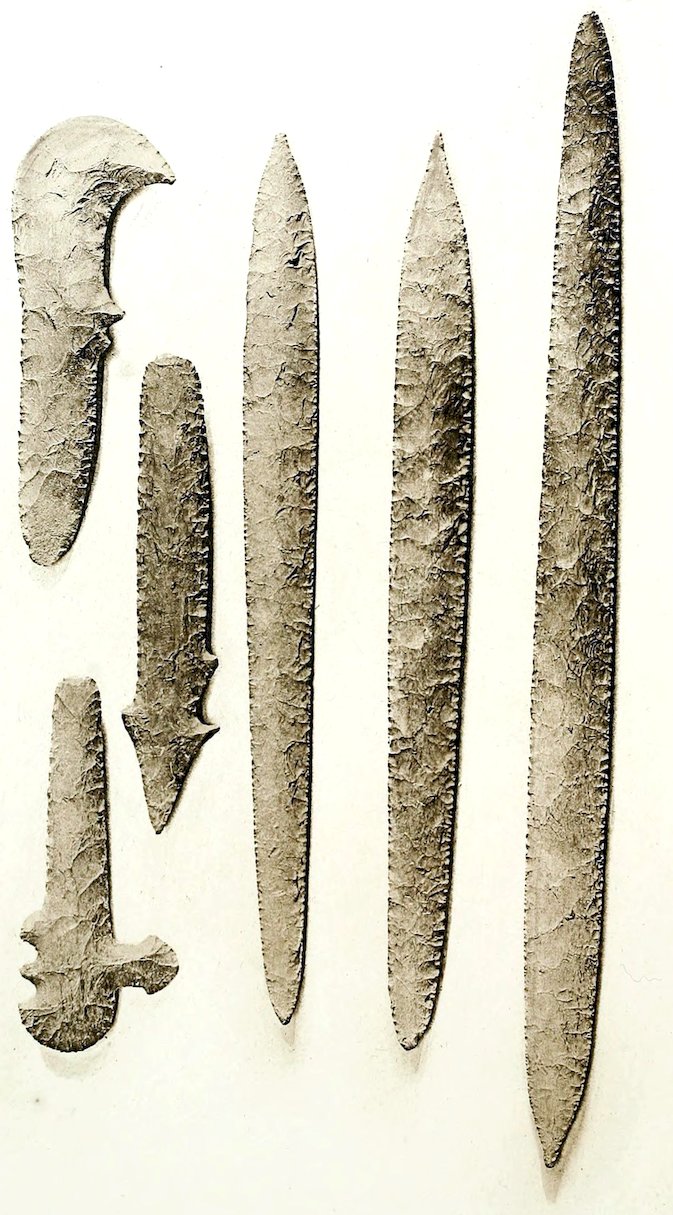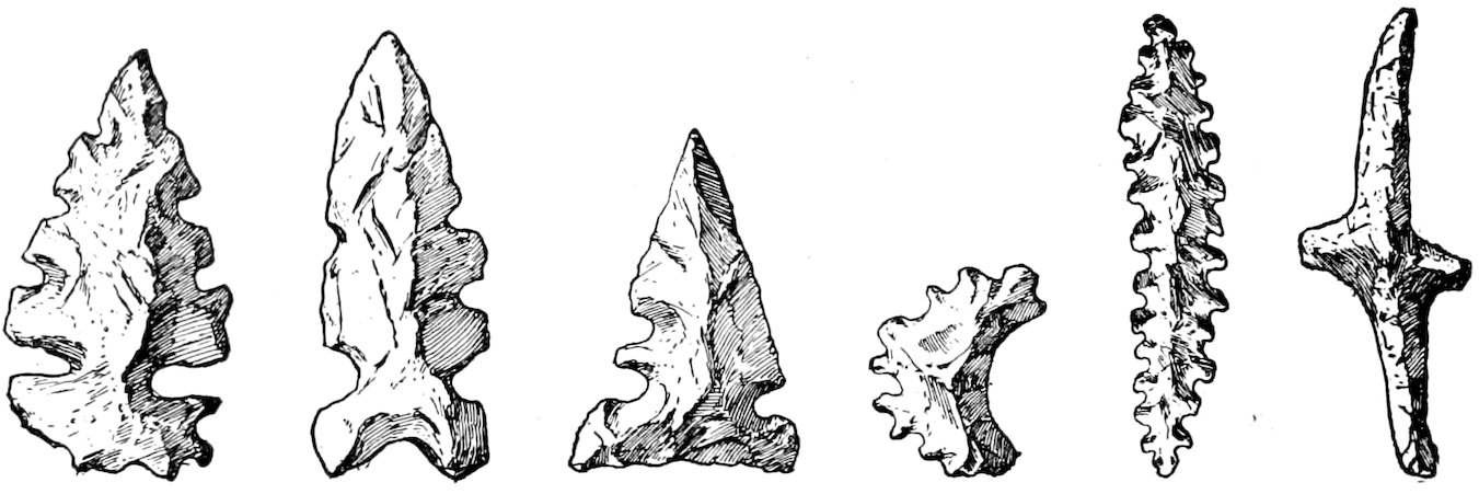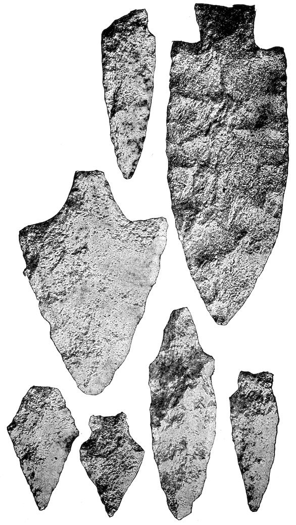 Colored plate of fine chipped implements. Materials: jasper, carnelian, agate, obsidian, and chalcedony. These were collected in the Willamette Valley, Oregon, and are selected as indicative of aboriginal American art in flint-chipping. B. W. Arnold’s collection, Albany, New York.
