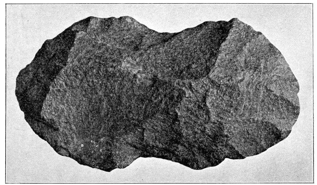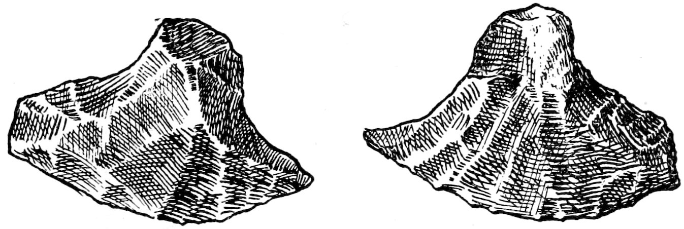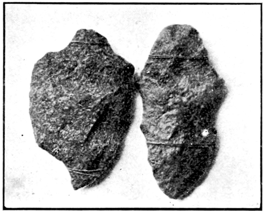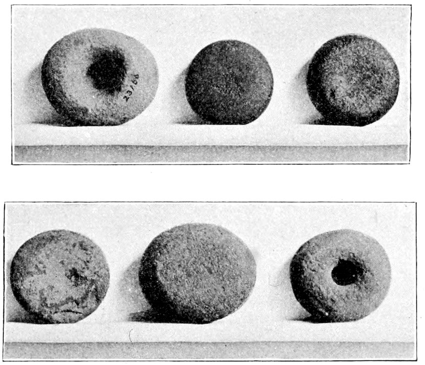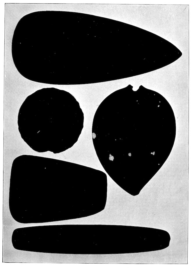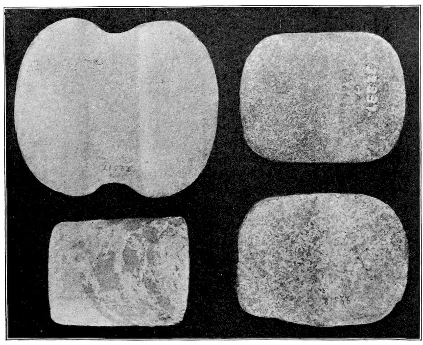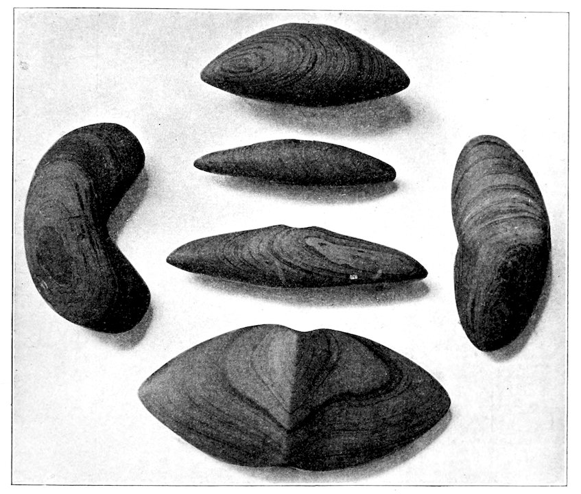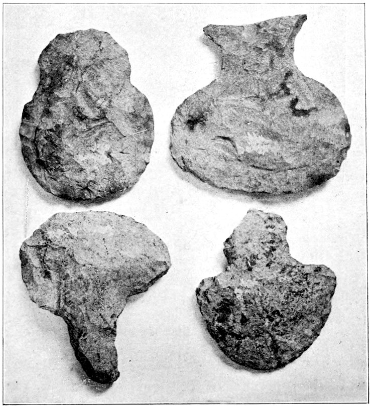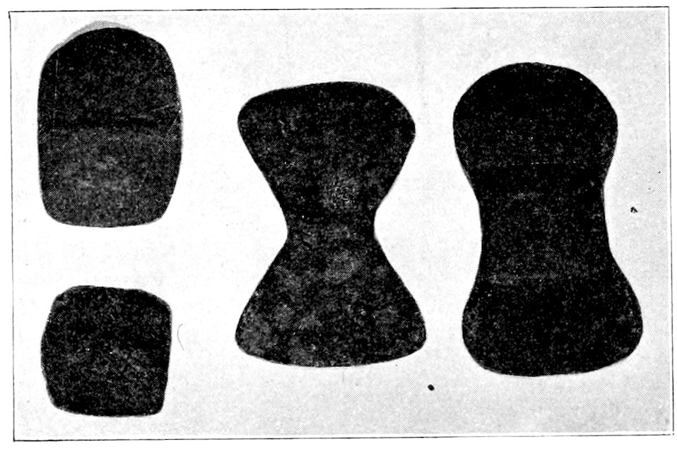 In the centre of Fig. 388 is a large disc of black slate around which is a well-defined rim. This form is rare. To the right of this specimen is a large quartzite bicave with a more extended rim. In Fig. 389 are four typical quartz and quartzite bicaves of general type.