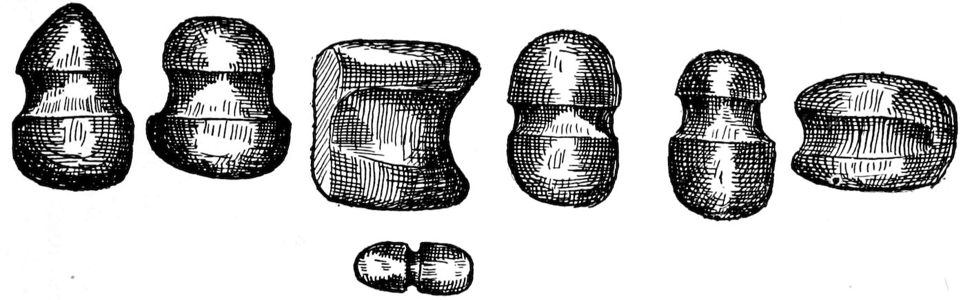 446Discoidals may be common, circular discs with flat polished sides, or circular with concave sides and perforated through the centre, or with the centre rimmed out, as certain specimens in Fig. 387. In this figure all are bicaves save three. That all of these small ones were used in playing chunky games I do not believe. They may have served as gaming-stones in other events. Some of the ruder ones, of the small stones I mean, may have been spindle-whorls.