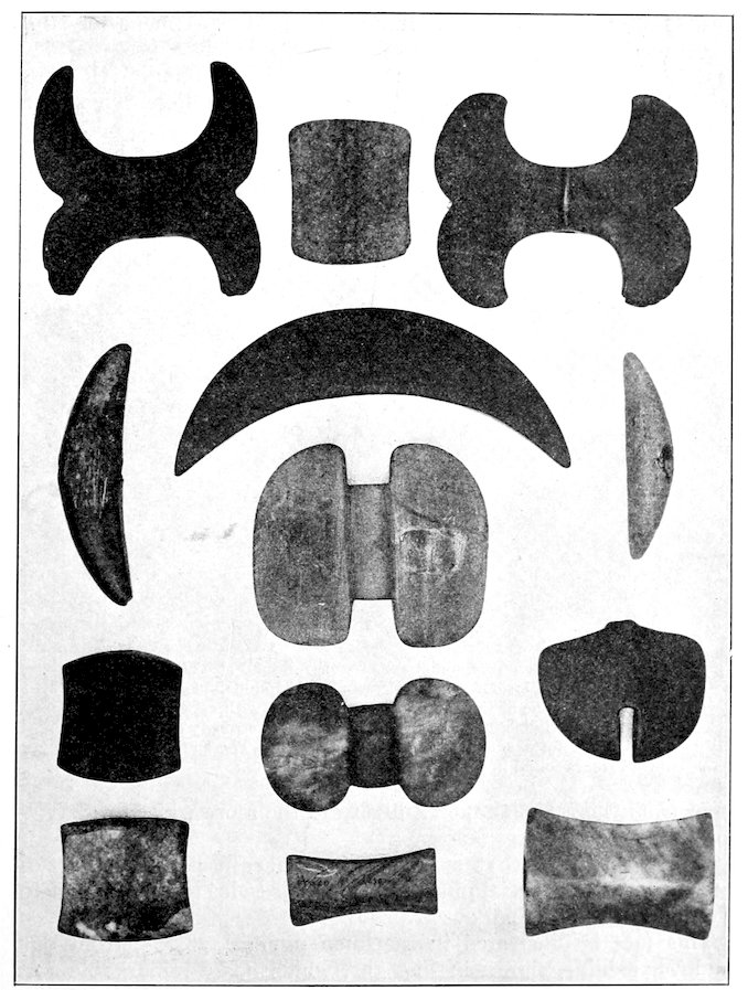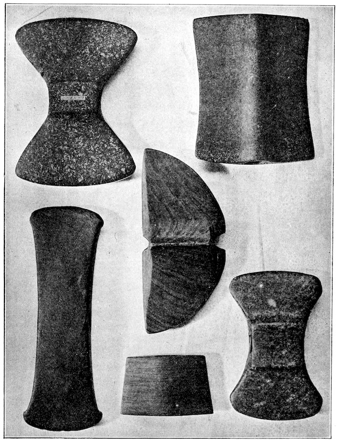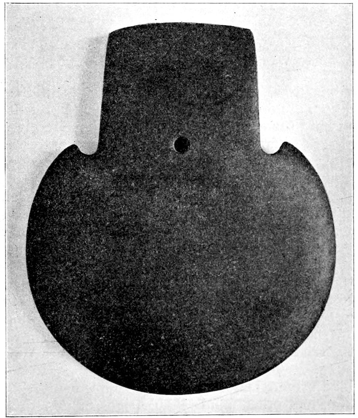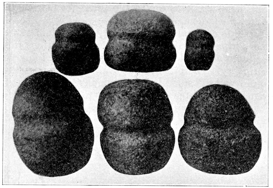 444Here we have all of the discs and bicaves present. In the lower row is a large polished disc with flat base, which is not concave on either side. To the left of it, one in which the concavity is slightly marked. The others range from this type to those that are perforated through the centre. In Fig. 390, Colonel Young’s collection, there is a bicave of unusual form, being high instead of broad, with slight concavities, yet having the central depression clearly indicated. These have been called “chunky” stones by those who have written regarding the famous Southern game played by various Indians in the South and which has been described so frequently that I dismiss it with the statement that round discs similar to those illustrated in this chapter were rolled along the ground and a spear or lance shot after them, and the stone when it fell over on the side was supposed to be transfixed by one of these projectiles. Or, the nearness of a projectile to the hole in the stone counted in various ways. There is an early historical reference to this game cited in the Conclusions, Volume II.