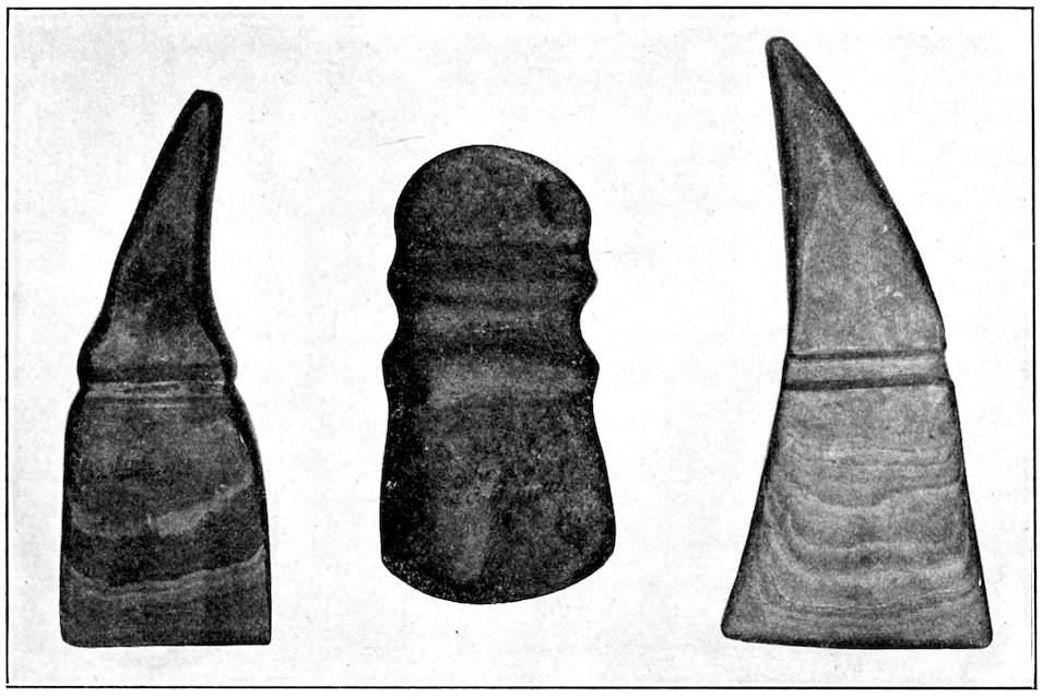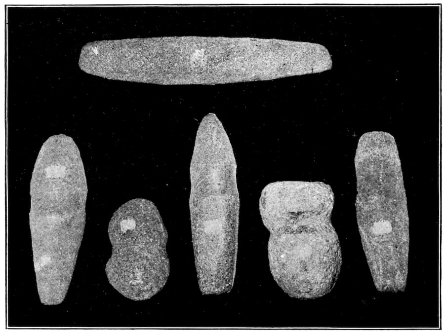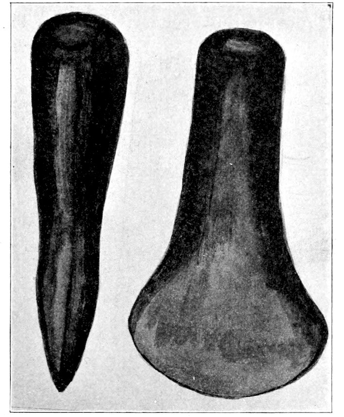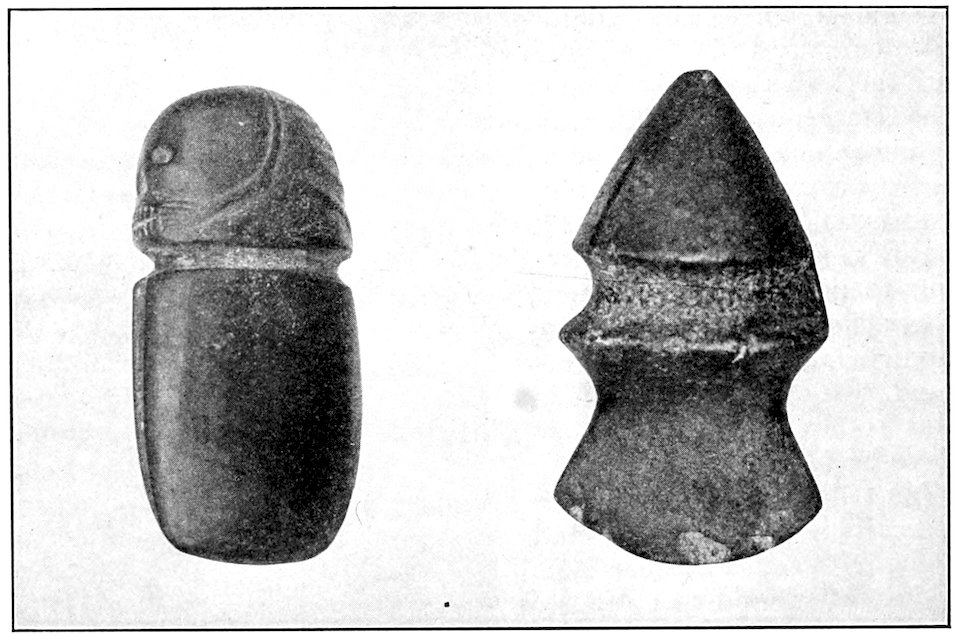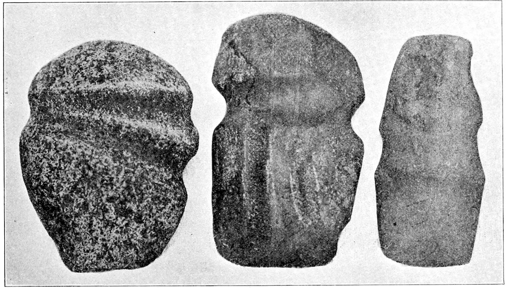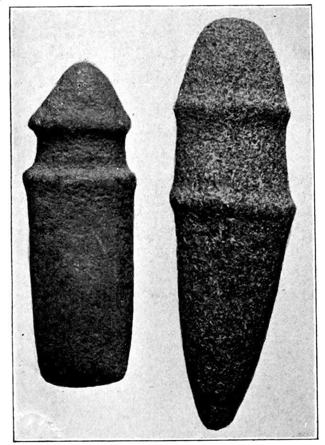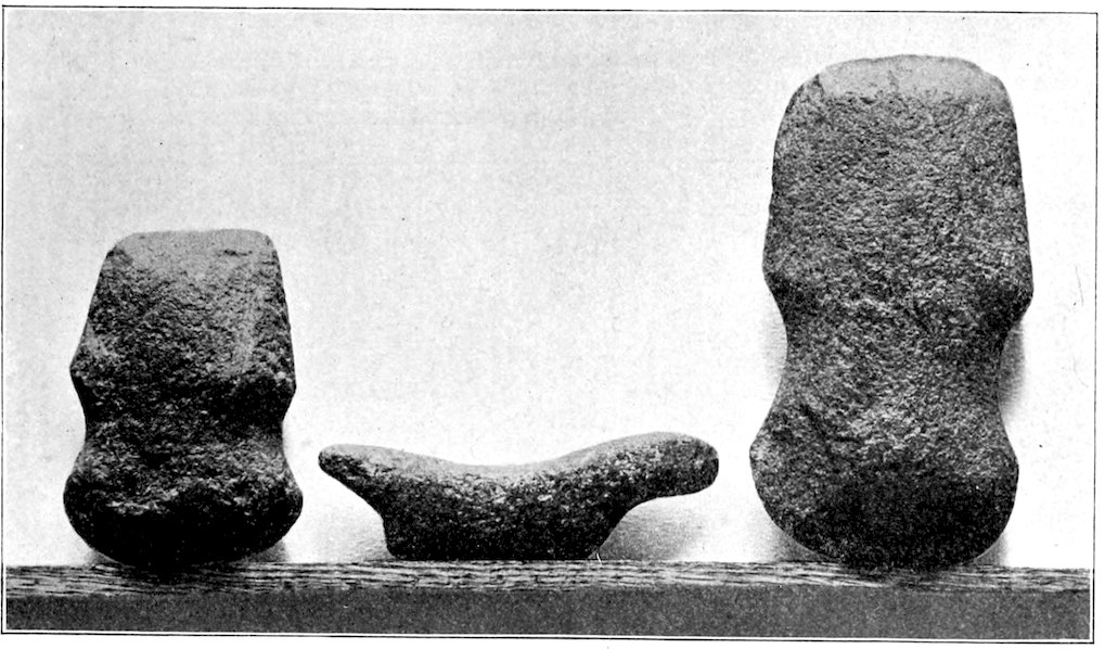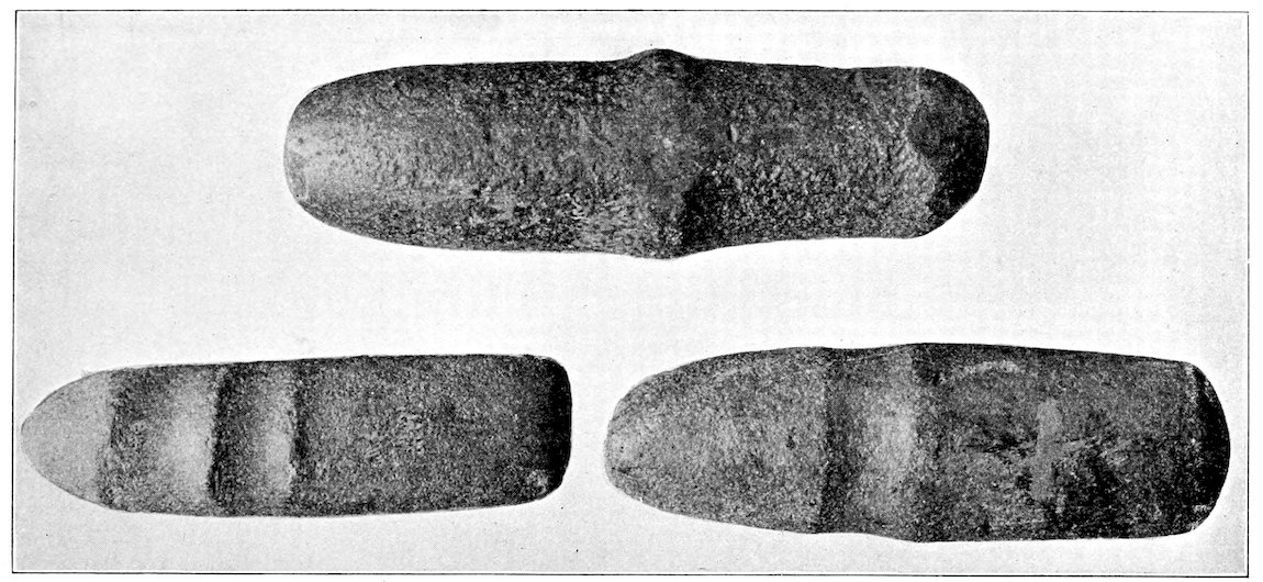 In Fig. 398, I present three large tube-like stones—perhaps pipes. This form, called by some of the early writers, “telescope,” is fairly common throughout the South. What they were used for, no one knows. I think the general explanation that they were shamans’ charms used in incantations, whereby the evil spirit was drawn from the bodies of the sick, is as good as any. We know that bone and wooden tubes were used for such purposes in historic times and these may have been also made use of in prehistoric times.