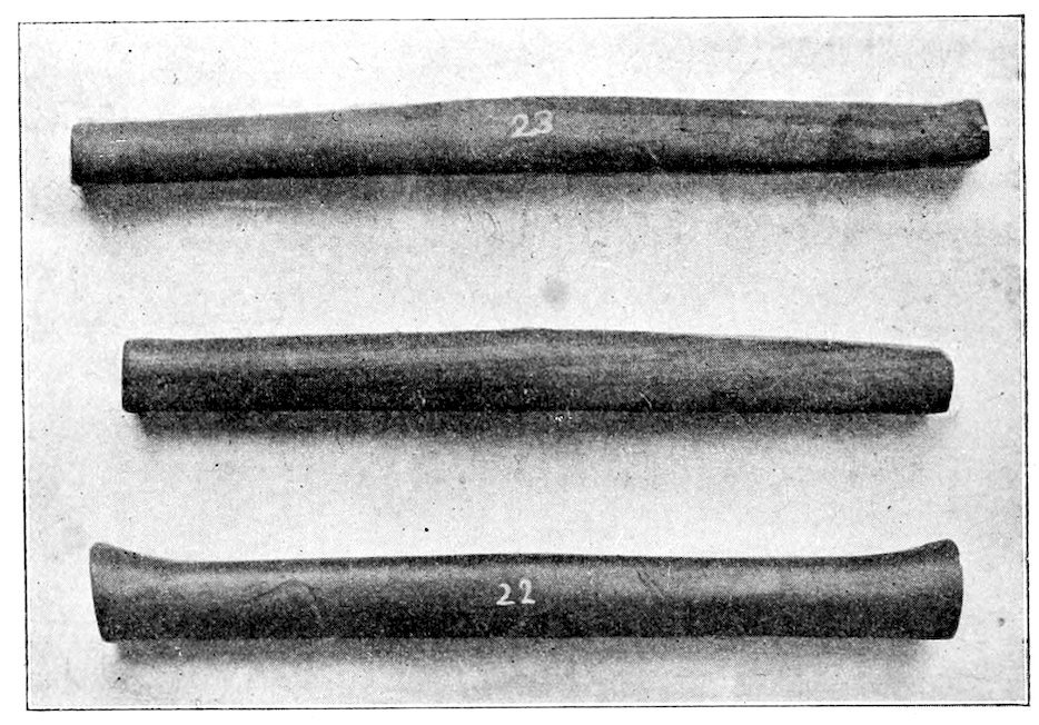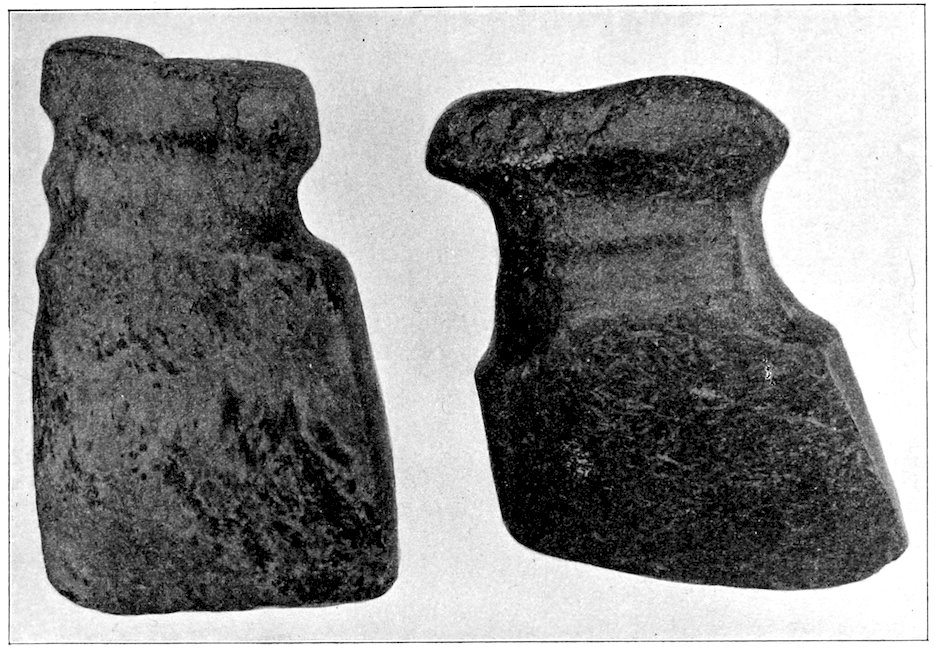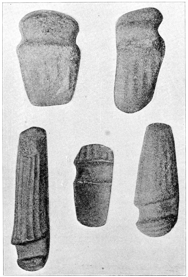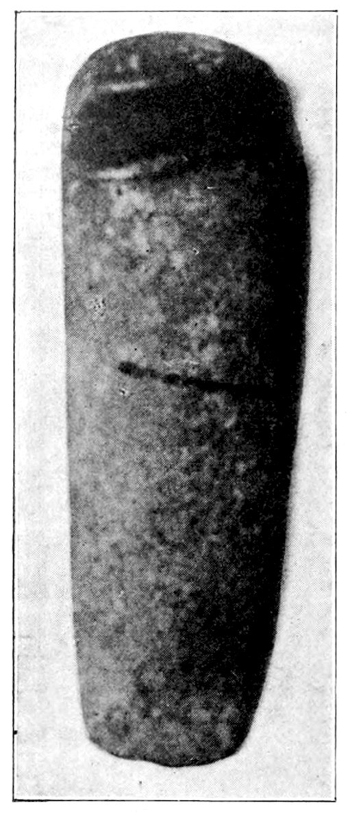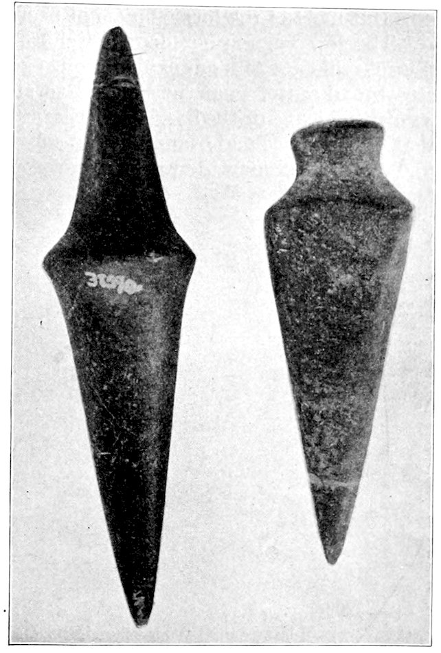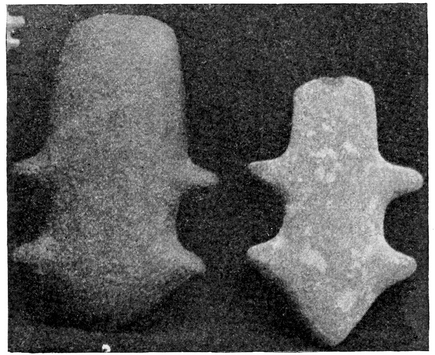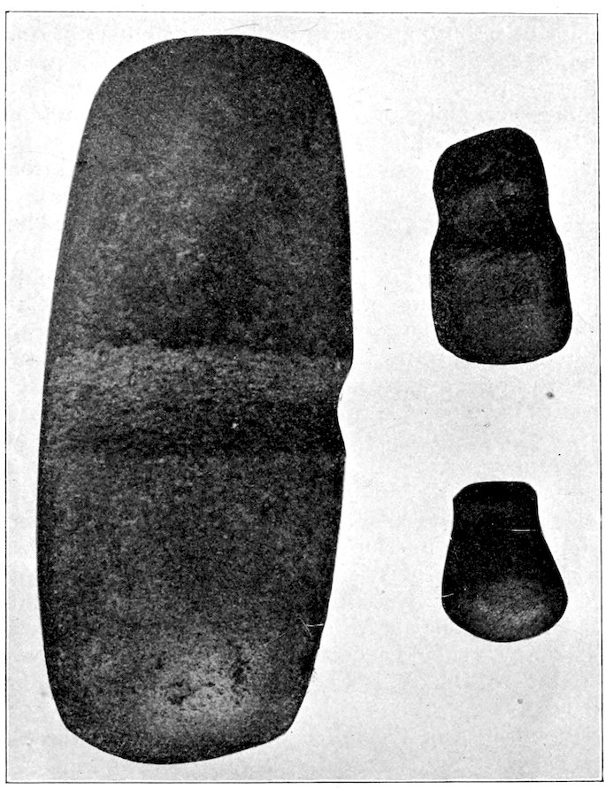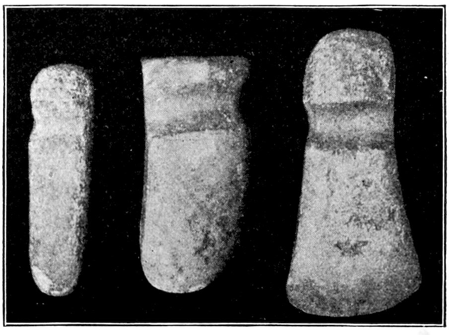 In Fig. 398, I present three large tube-like stones—perhaps pipes. This form, called by some of the early writers, “telescope,” is fairly common throughout the South. What they were used for, no one knows. I think the general explanation that they were shamans’ charms used in incantations, whereby the evil spirit was drawn from the bodies of the sick, is as good as any. We know that bone and wooden tubes were used for such purposes in historic times and these may have been also made use of in prehistoric times.