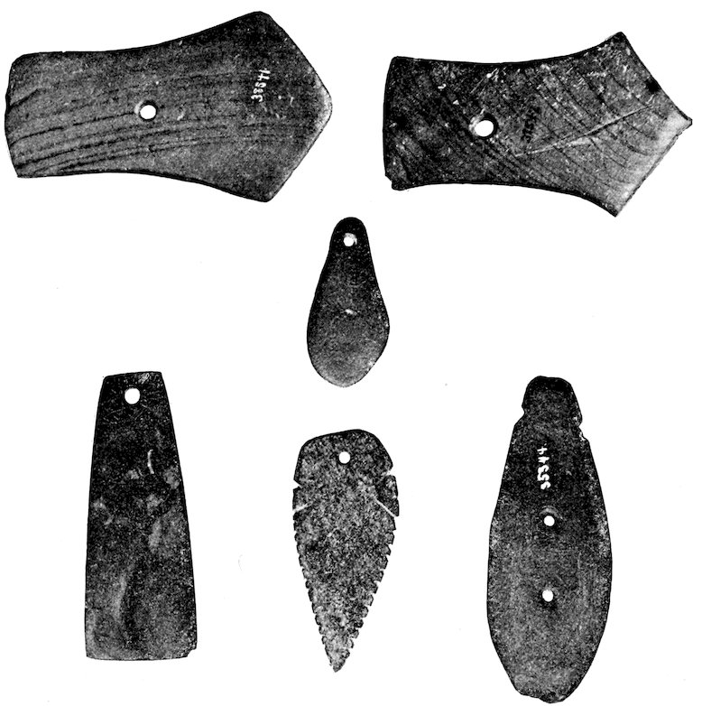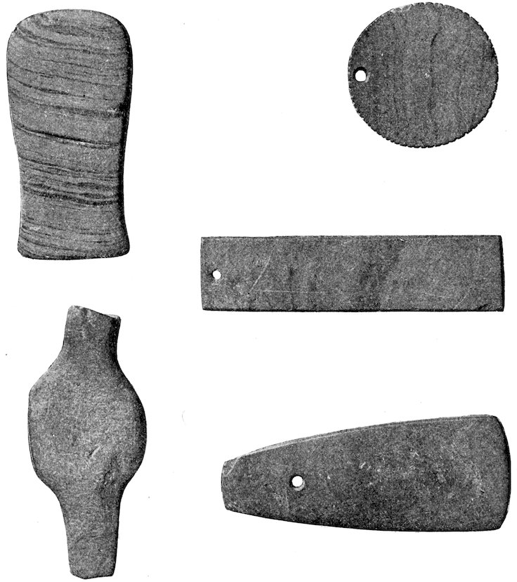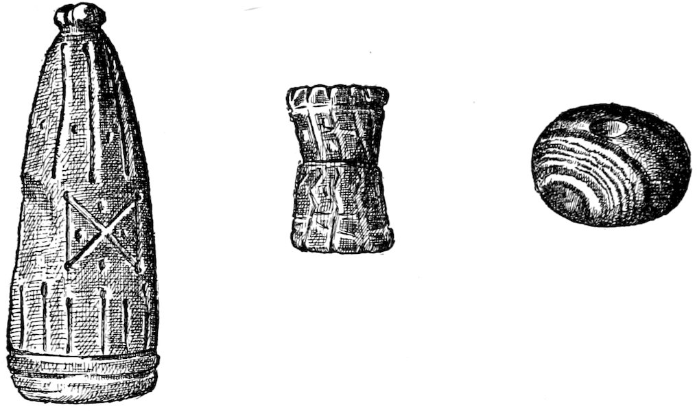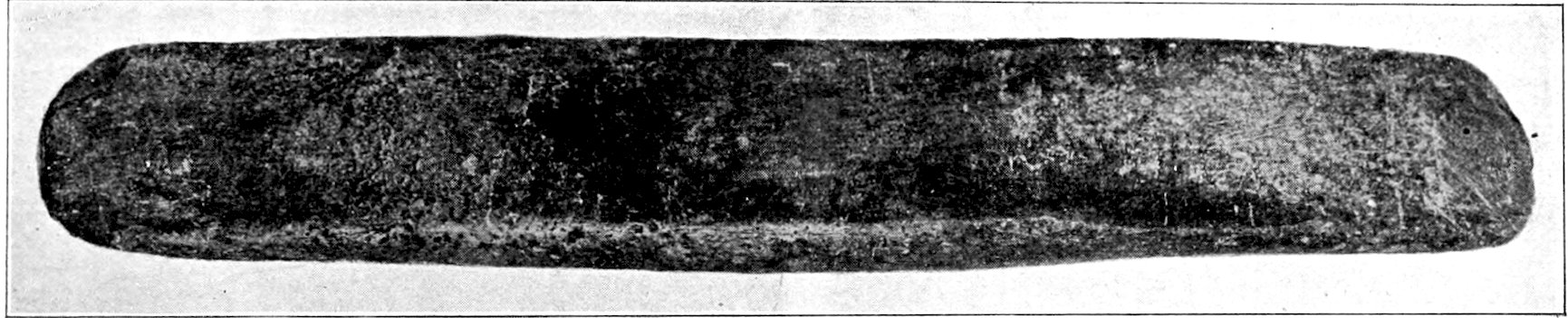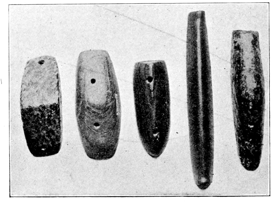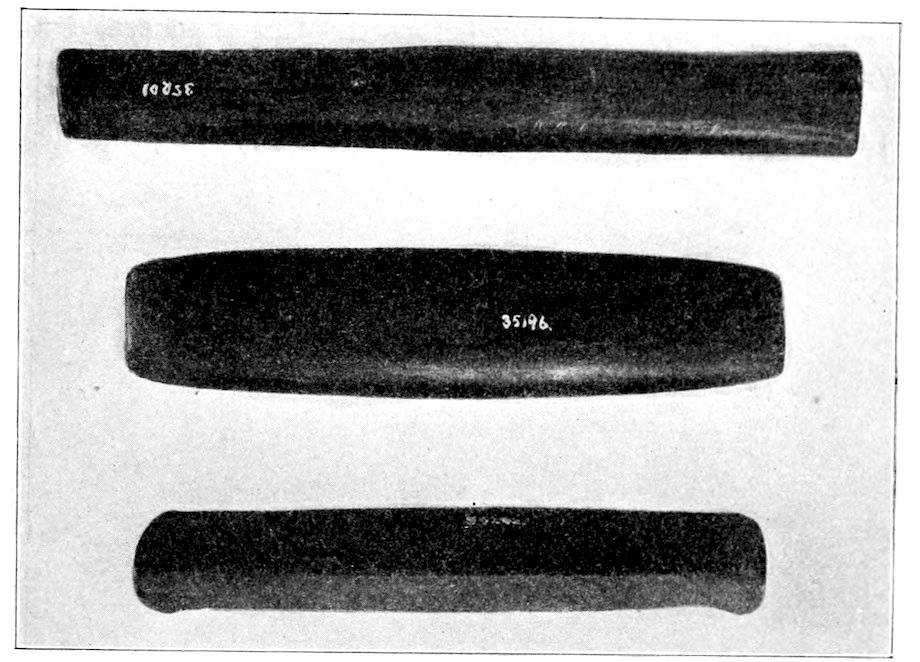 455Various uses have been assigned these and I have commented in so many of my writings on tubes, that one would tell an old story to repeat all that has been said. It suffices to say, that passing from the bead class to larger objects, the size of marbles, these may have been worn as stone beads. But these stone objects are usually made of banded slate. They may be oval in outline, such as Fig. 395, or long and slender, as Fig. 396. Again, some are grooved, others flattened, others rounded, and yet some are square.