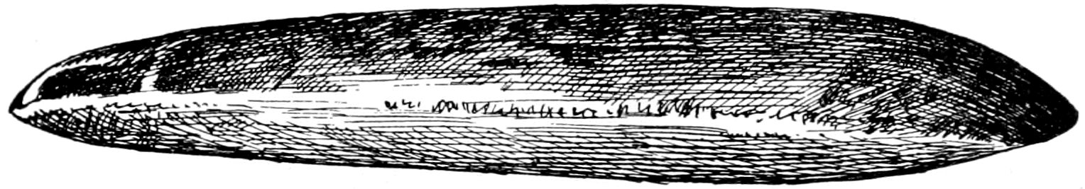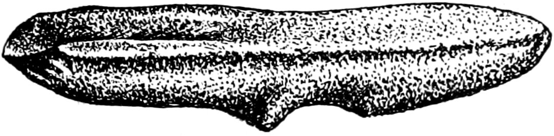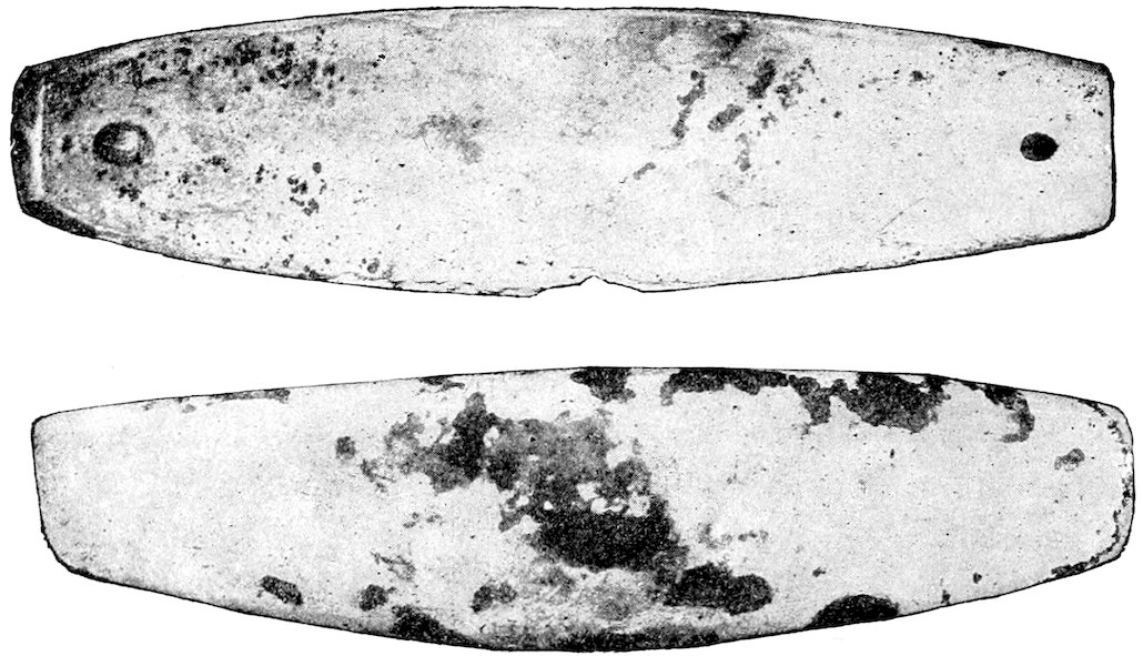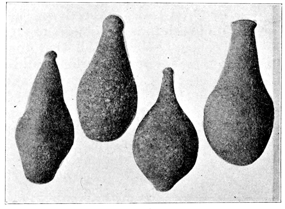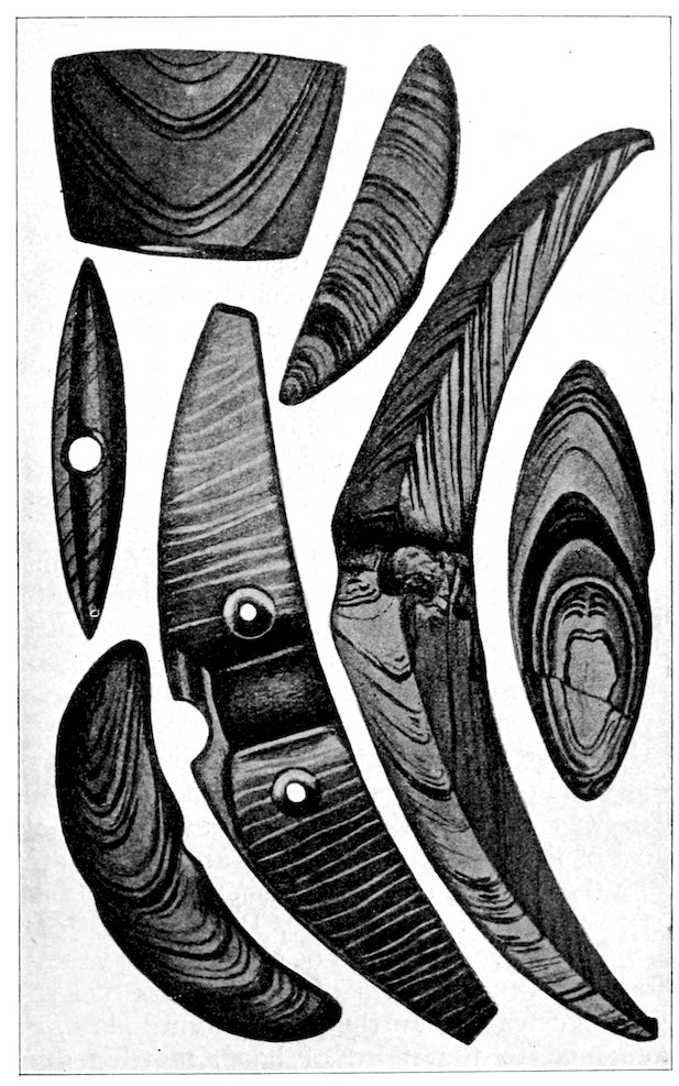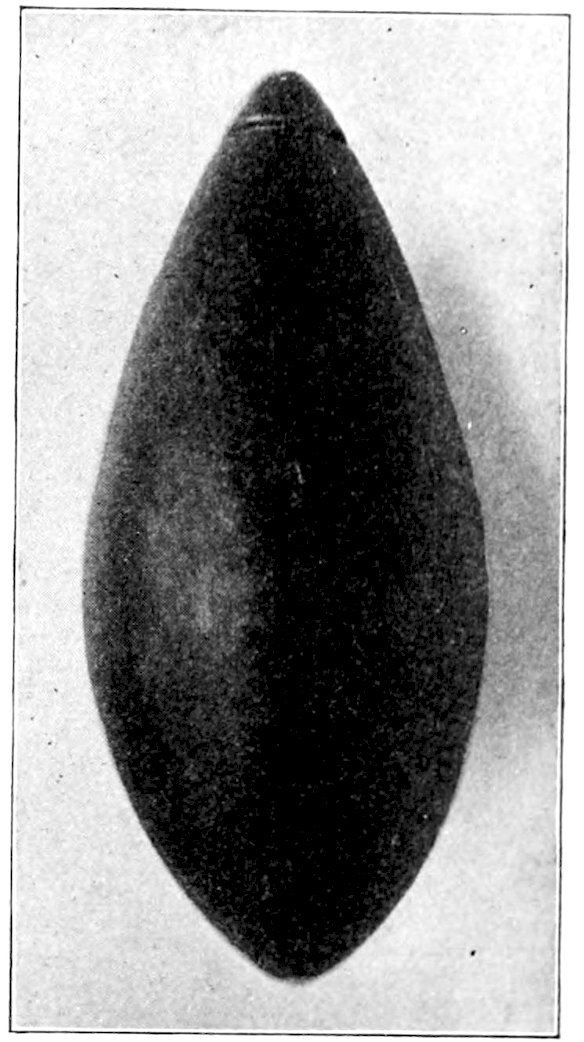 455Various uses have been assigned these and I have commented in so many of my writings on tubes, that one would tell an old story to repeat all that has been said. It suffices to say, that passing from the bead class to larger objects, the size of marbles, these may have been worn as stone beads. But these stone objects are usually made of banded slate. They may be oval in outline, such as Fig. 395, or long and slender, as Fig. 396. Again, some are grooved, others flattened, others rounded, and yet some are square.