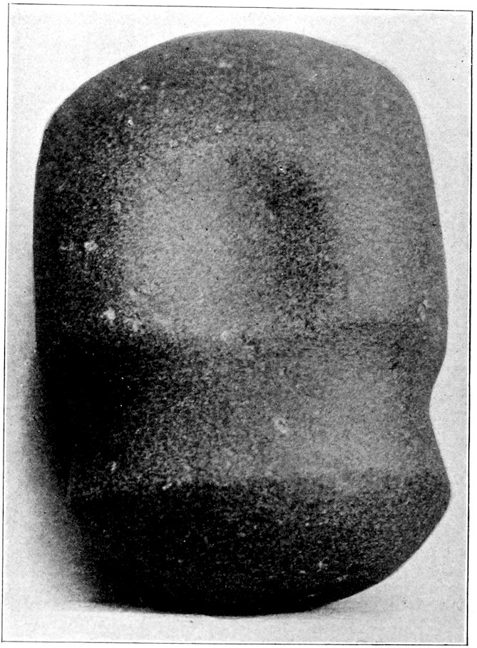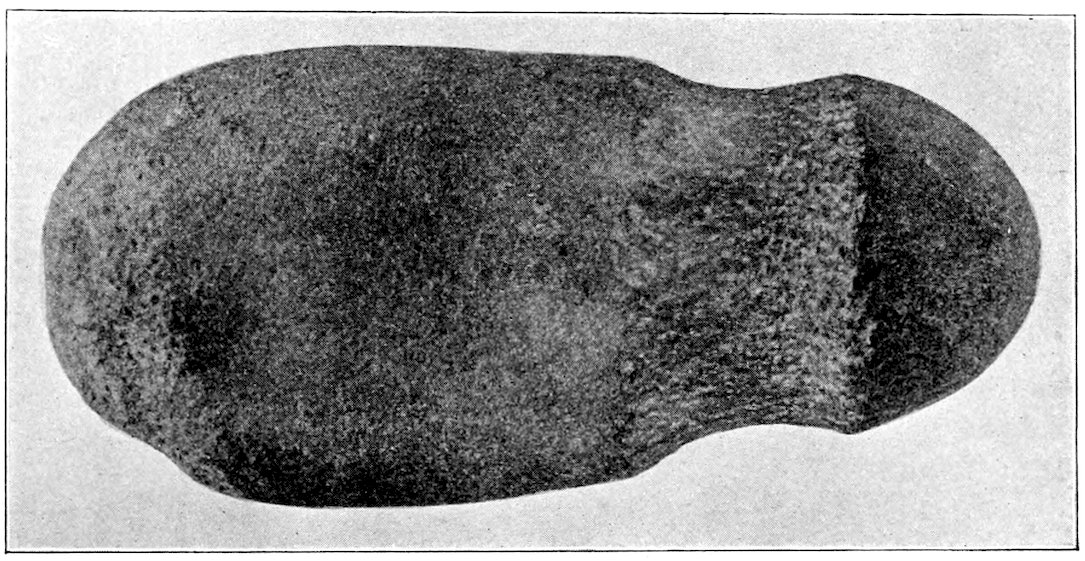 451“Prehistoric objects of unknown use whose most typical form is that of a double-convex or double-concave lens. The perimeter is a circle and the sides range from considerably convex through plane to deeply concave. The diameter varies from 1 in. to 8 in., the thickness from one fourth of an inch to 6 inches, very rarely passing these limits; the two dimensions have no definite relation to each other. Some specimens are convex on one face and plane on the other; but when one face is concave the other is also. Of the latter form many have a secondary depression at the centre; others have a perforation which is sometimes enlarged until the disc becomes a ring. They are made principally of very hard rock, as quartz, flint, jasper, novaculite, quartzite, porphyry, syenite, and the like, though stone as soft as marble, sandstone, barite, and even steatite was sometimes chosen. No type of relics is more difficult to classify than these discs. The name first given them, and by which they are still commonly known, is ‘chunky stones,’ from the native name of the game played with analogous discs by Southern Indians. But the description of the game, considered in connection with the great variation in size and material of the specimens, shows that only a small percentage of them could have been thus utilized. Culin believes that a limited number may be definitely regarded as ‘chunky stones.’ He recognizes three types: (1) perforated (least common); (2) symmetrical, unperforated; (3) asymmetrical, unperforated. A similar diversity is observed in the stones used in the analogous Hawaiian game of maika.[44] From the smooth, symmetrical, highly polished ‘chunky’ stone they merge by insensible gradations into mullers, pestles, mortars, pitted stones, polishing- and grinding-stones, hammers, sinkers, club-heads, and ornaments, for all of which purposes except the last they may have been used in some of their stages, so that no dividing-line is possible. They present various styles and degrees of finish. Many retain their natural surface on both sides with the edge worked off by grinding or pecking, the latter marks possibly resulting from use as hammers. The sides may be ground down while the edge remains untouched; or, when made from a thick pebble, the sides may be pecked and the edge ground. Some specimens which are entirely unworked require very close examination to distinguish them from others whose whole surface has been artificially produced. It is possible, however, to arrange a large number of specimens from one locality in a regular series from a roughly chipped disc to a finished product of the highest polish and symmetry. The finest specimens, in greatest numbers, come from the states south of the Ohio River, and from Arkansas eastward to the Atlantic. The territory within a radius of one hundred miles around Chattanooga, Tennessee, and for about the same distance around Memphis, is especially rich in them. From southeastern Ohio to central Missouri considerable numbers have been found, though few of them are as well wrought as those from the South. Rather rough ones occur along the Delaware River. Beyond the limits indicated, the type practically disappears. Discoidal stones corresponding closely with Eastern types, save that the faces are rarely concave, are found in the Pueblo country and in the Pacific States.”