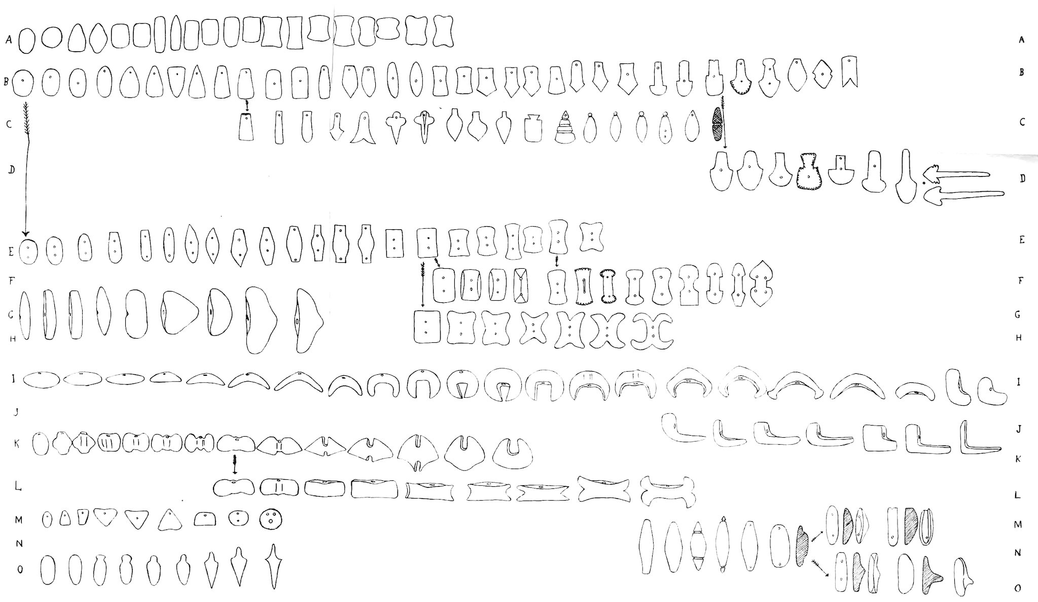 Cylindrical forms may be said to begin with the beads and end with the long tubular objects, which are really pipes.