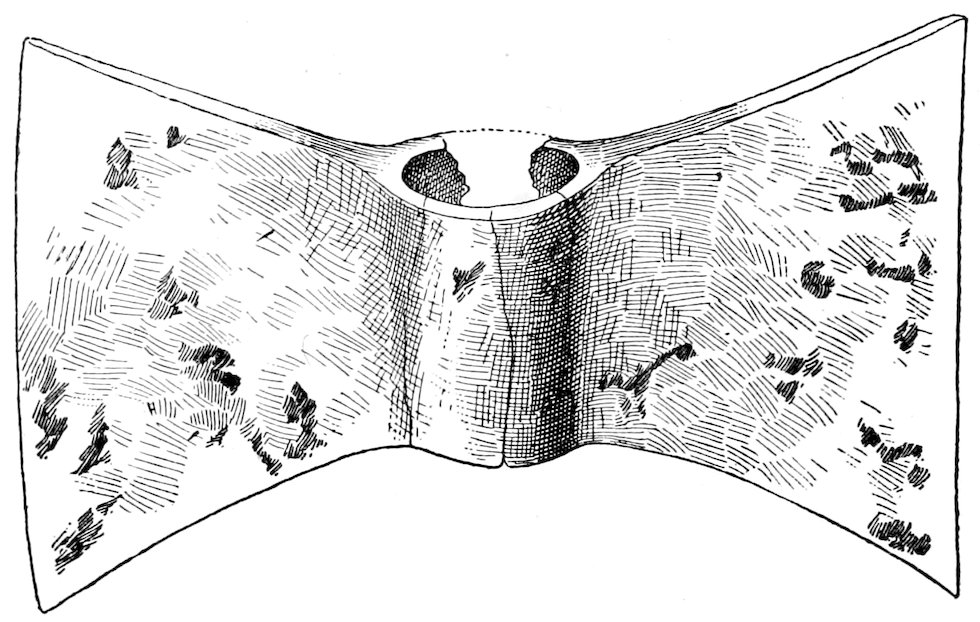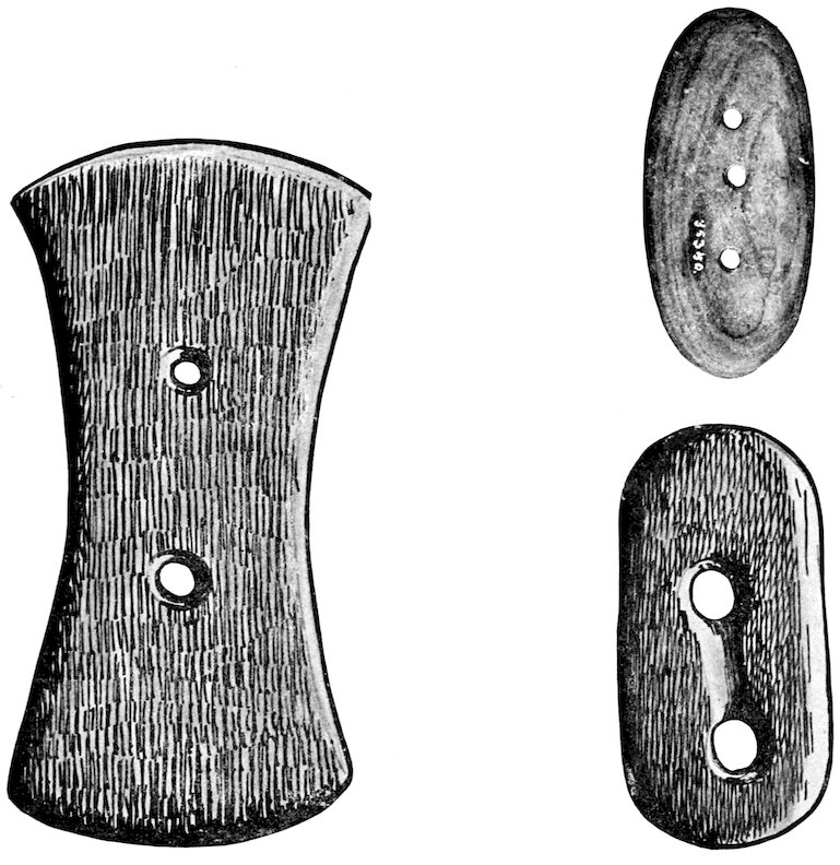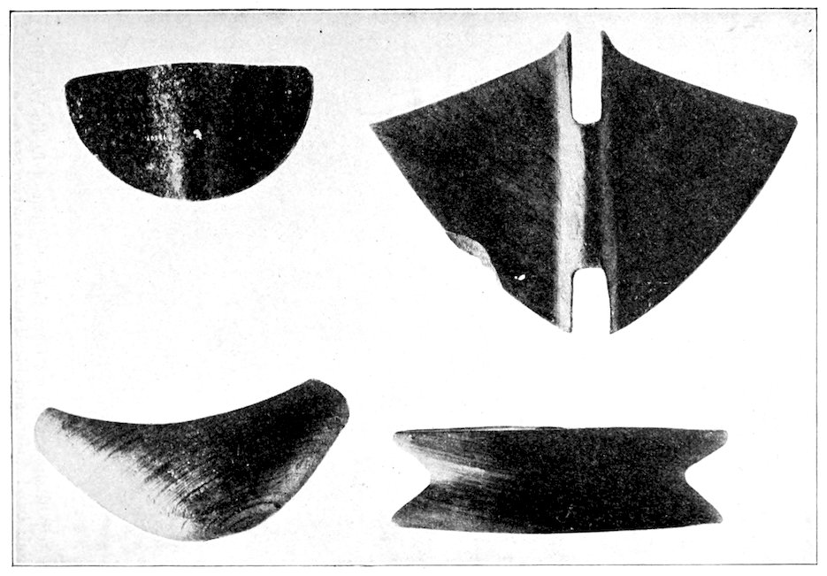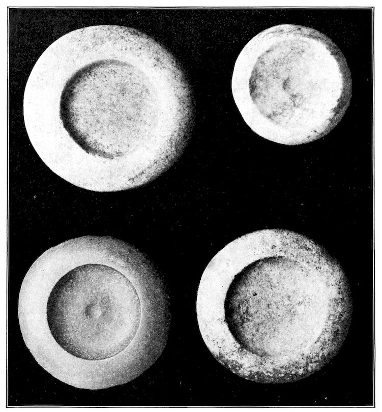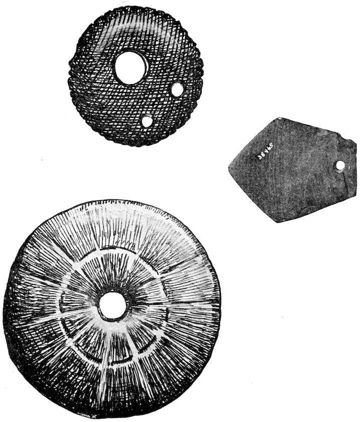 Of these discs, especially numerous in Tennessee, Kentucky, and Ohio and along the Ohio River, there are three kinds: simple discs, discs with slightly depressed centres, and ornamented discs. The bicaves themselves are alike in outline, having depressed centres. But there are great differences in the depressions.