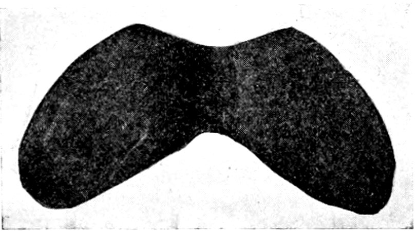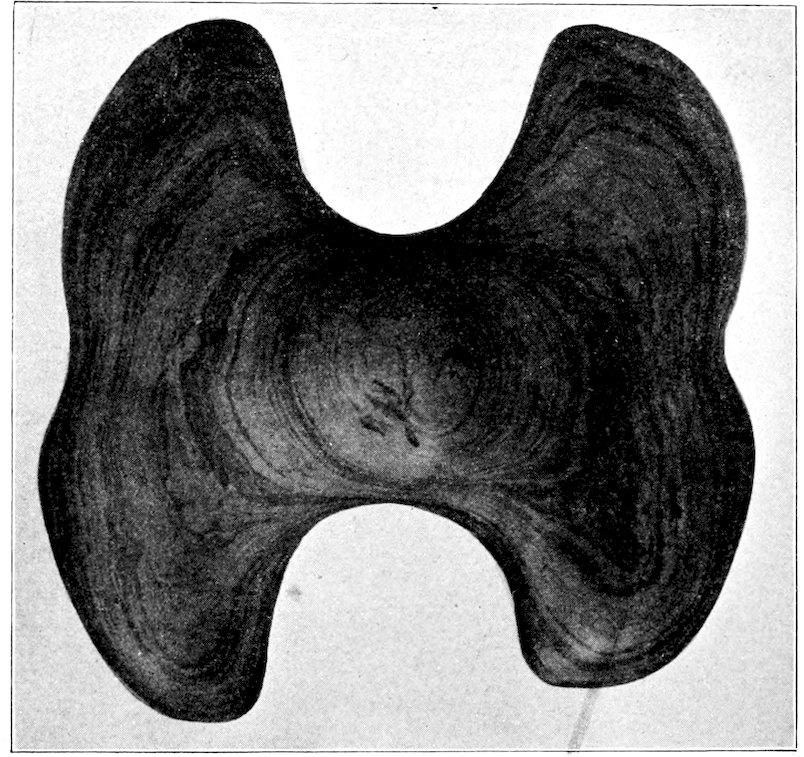 Fig. 391. (S. 1–2.) Quartzite bicave found on sandy bank of Hightower River, Cherokee County, Georgia. Weight, 37 ounces. Translucent between the depressions. Pink by reflected light and pink by transmitted light. It has a perfect secondary depression, and is highly polished and perfect. H. M. Whelpley’s collection, St. Louis, Missouri.