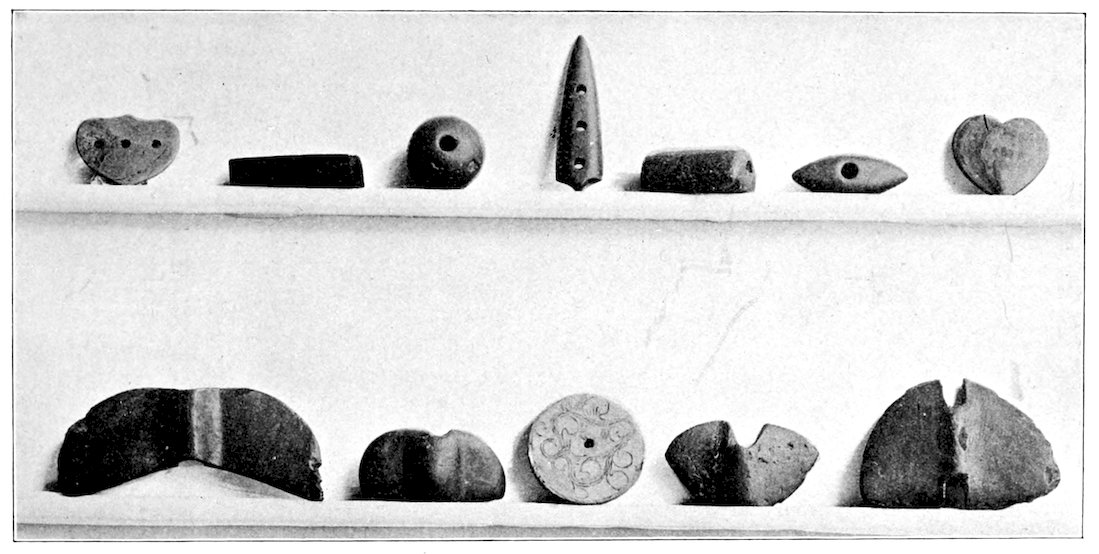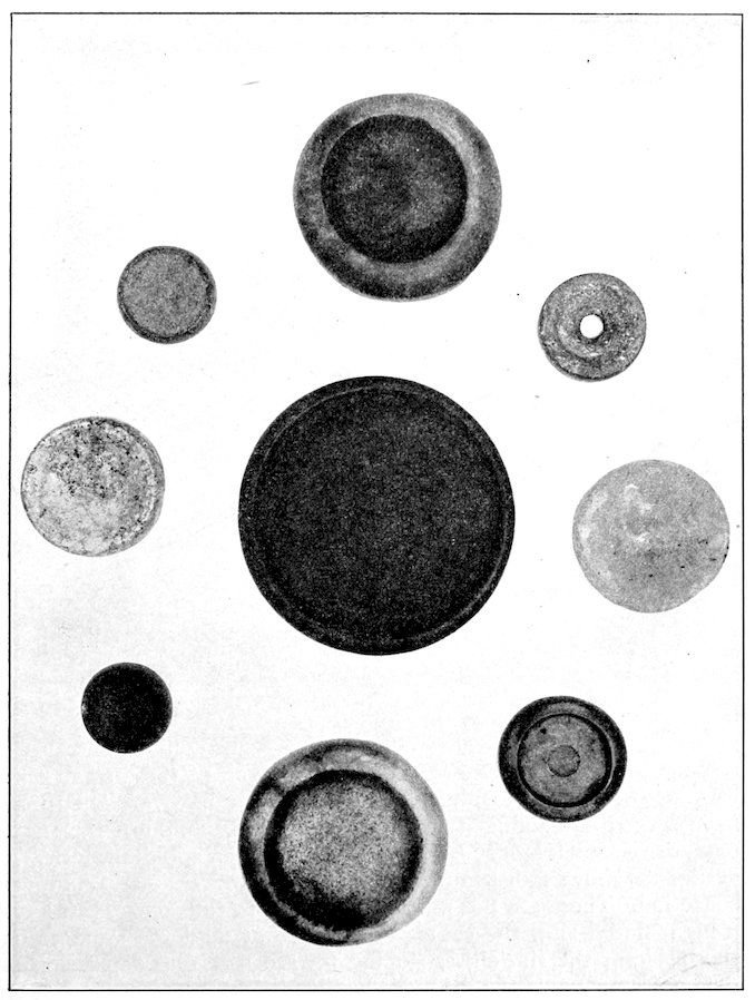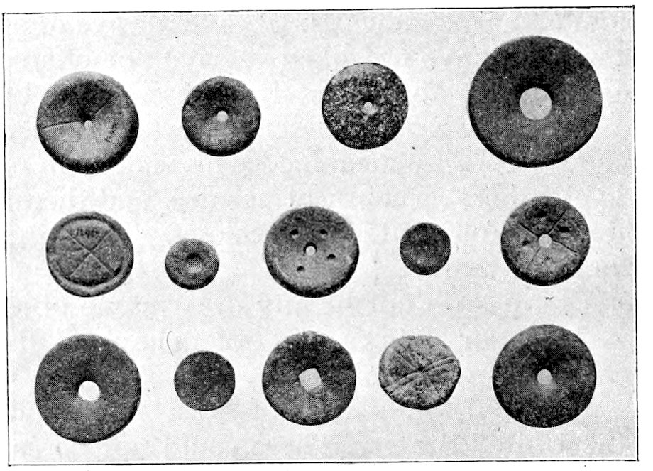 The culture at Moundville was high as is evinced by the character of the objects found by Mr. Moore. These discs were more or less thickly smeared with paint, cream color or red.